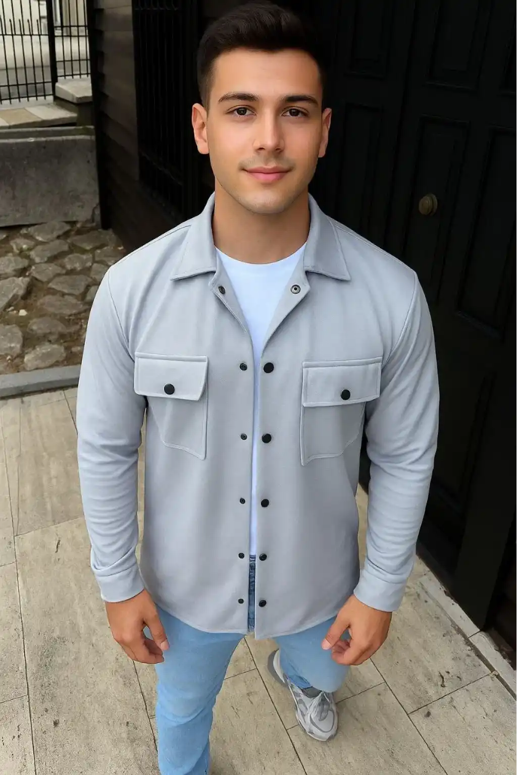 Erkek Diagonal Kumaş Cepli Çıtçıtlı uzun Kollu, Gömlek Oversize Rahat Kalıp Günlük Şık Stil - Gri