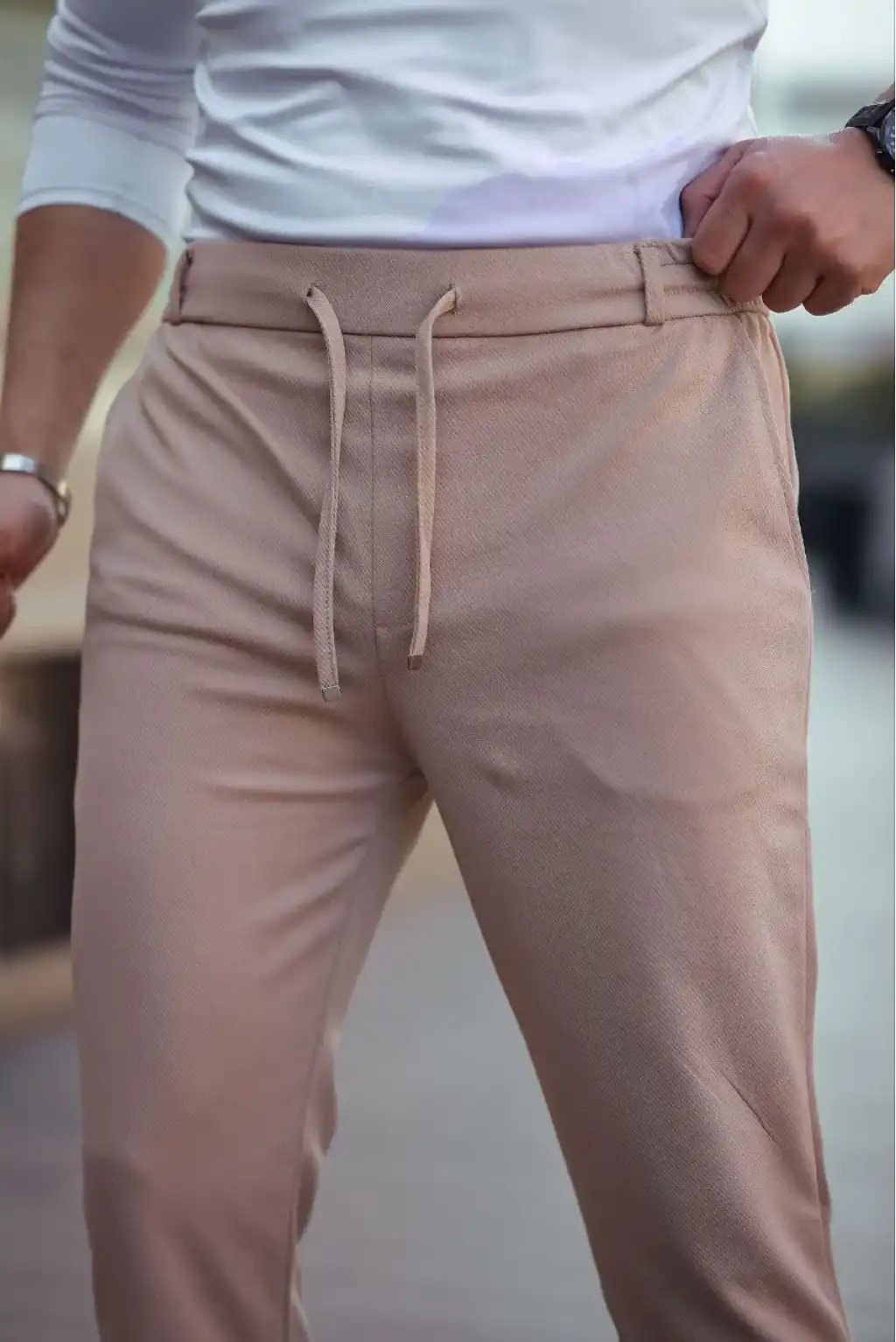 Erkek Diagonel Mikro dokulu Cepli Pantolon - Bej