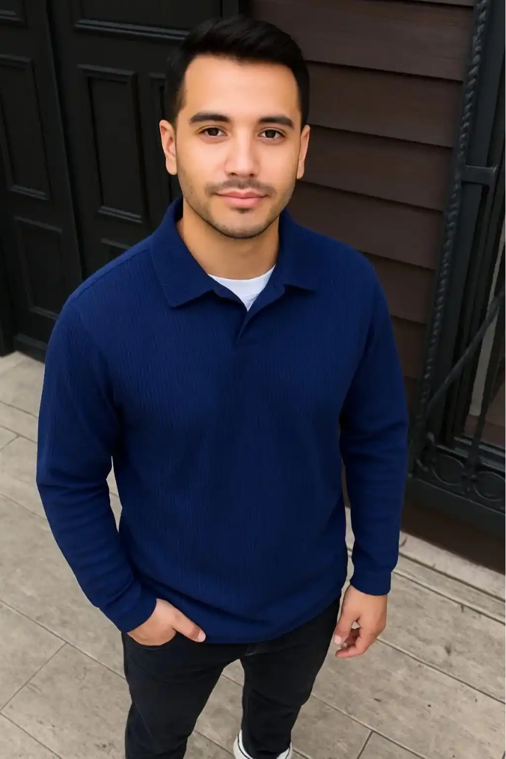 Erkek Fitilli Polar Sweatshirt – Düğmesiz Polo Yaka, Oversize Rahat Kalıp, Kalın Polar Kumaş, Kışlık ve Baharlık Şık Günlük Üst - Lacivert