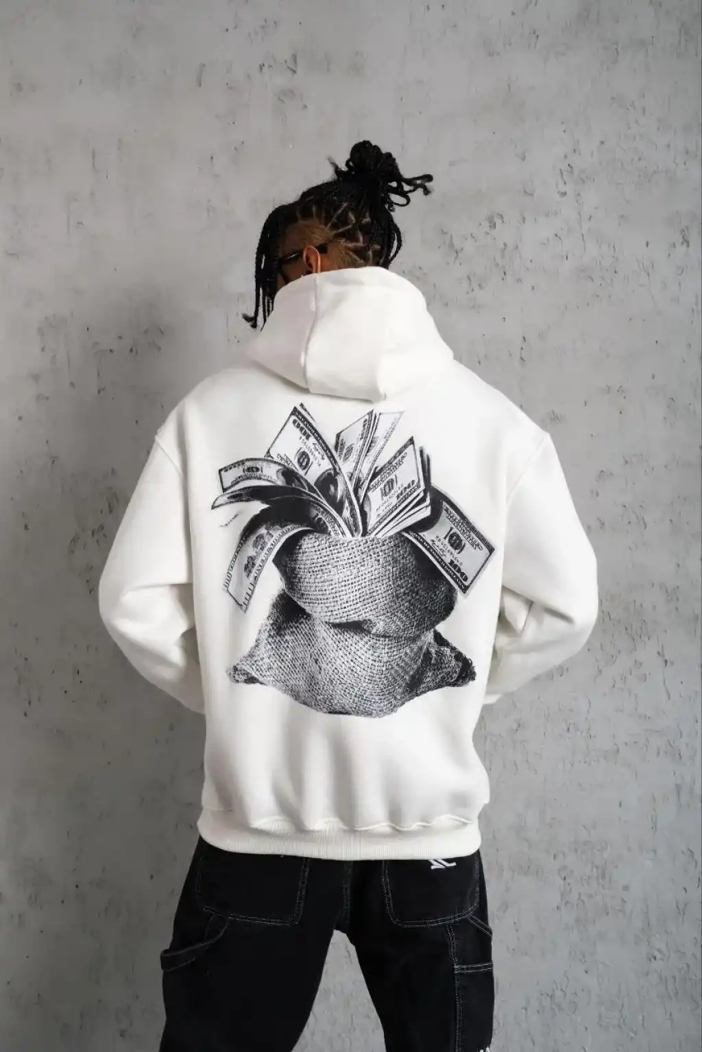 Erkek Kanguru Cep Baskılı Kapüşonlu Sweatshirt - Beyaz