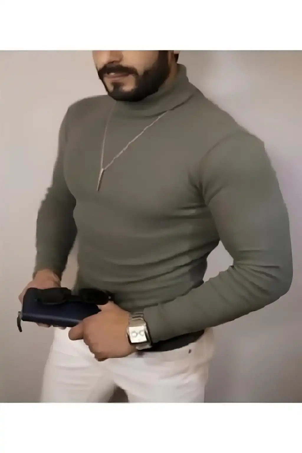 Erkek Kaşkorse Boğazlı Full Likralı Fitilli Body Kazak - Haki