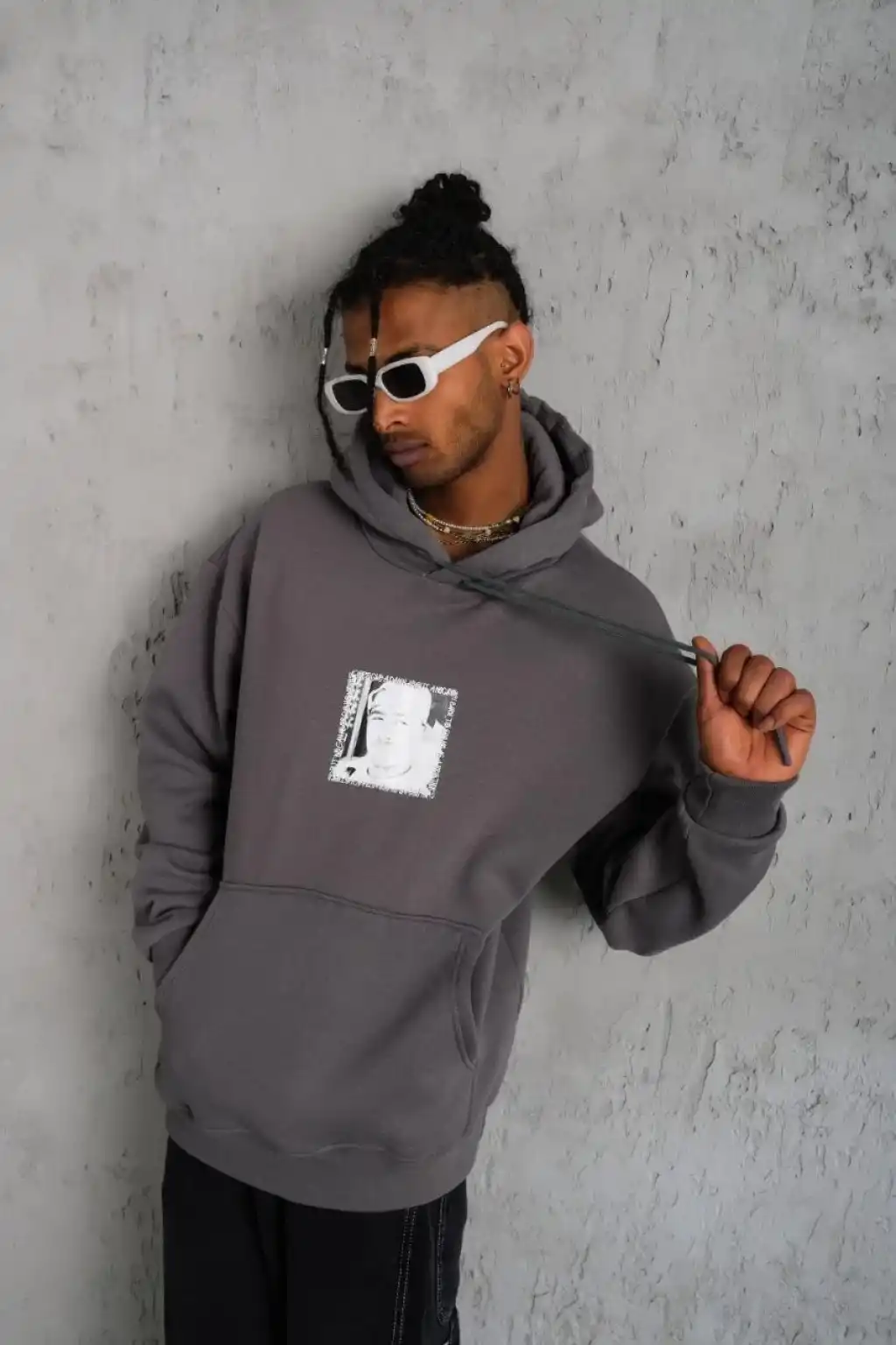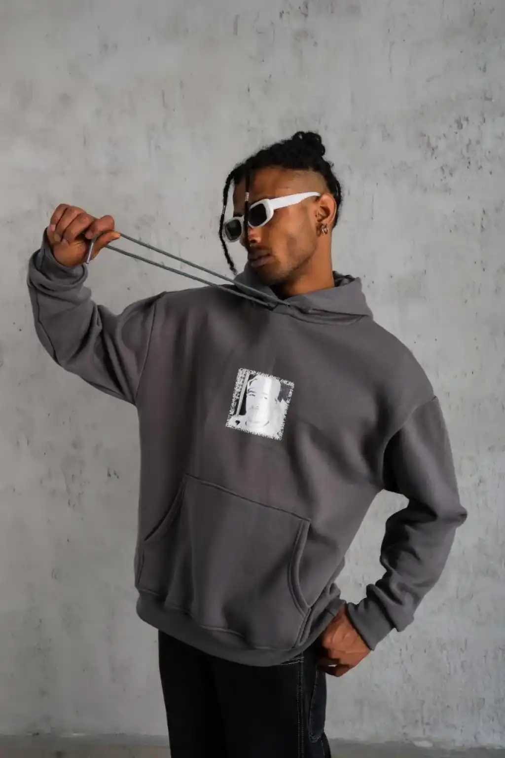 Erkek Ön Arka Baskılı Kapşonlu Sweat - Gri