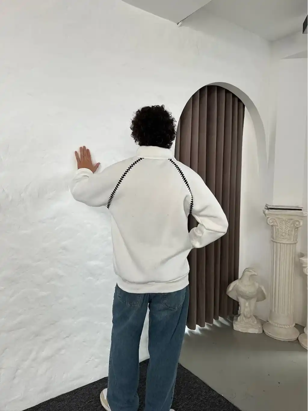 Erkek Tam Fermuarlı Desenli Polar Sweat – Siyah Multicolor Figür Desen Yakalı, Uzun Kollu, Oversize Rahat Kalıp- Beyaz