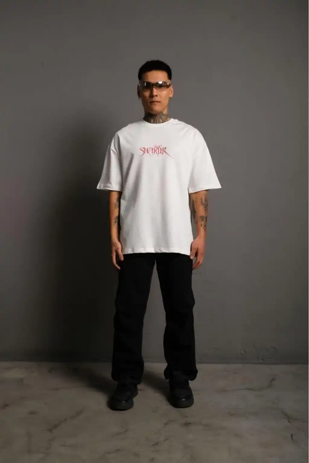 Erkek Oversize Tişört – Beyaz 24/1 Penye Kumaş, Bisiklet Yaka, Ön & Arka Baskılı, Streetwear Tarzı Rahat Büyük Kalıp T-Shirt- Beyaz