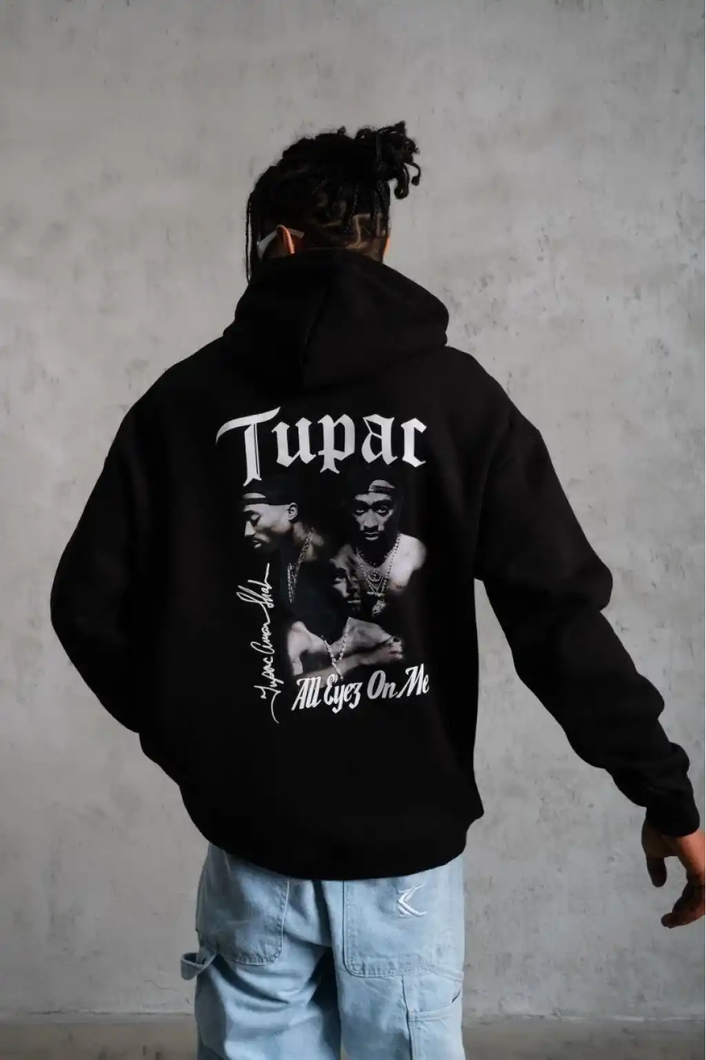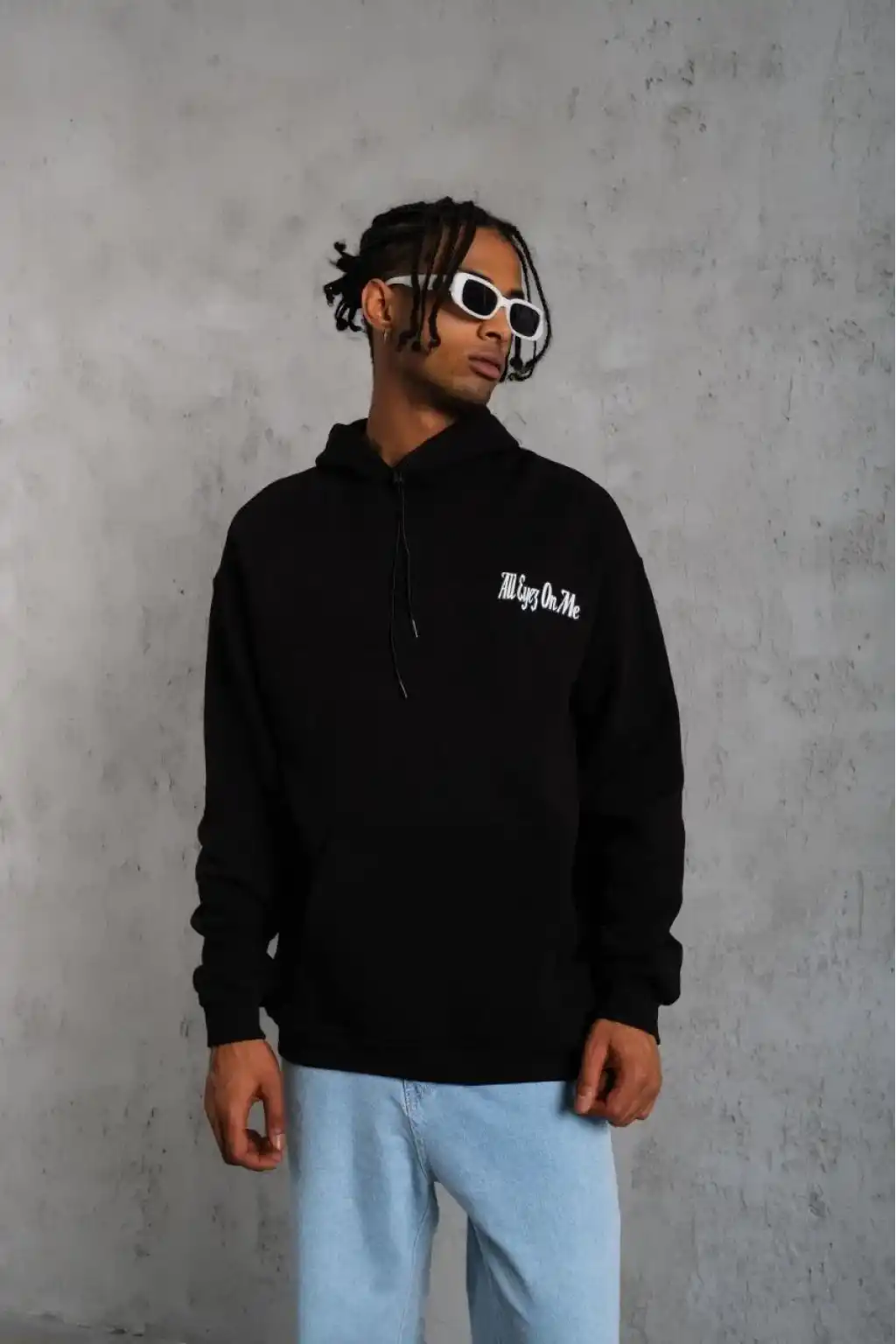 Erkek Oversize Üç İplik Kapüşonlu Sweat – Siyah Kol ve Etek Ribana Detaylı, Ön ve Sırt Baskılı, Kanguru Cepli Rahat Kalıp Model