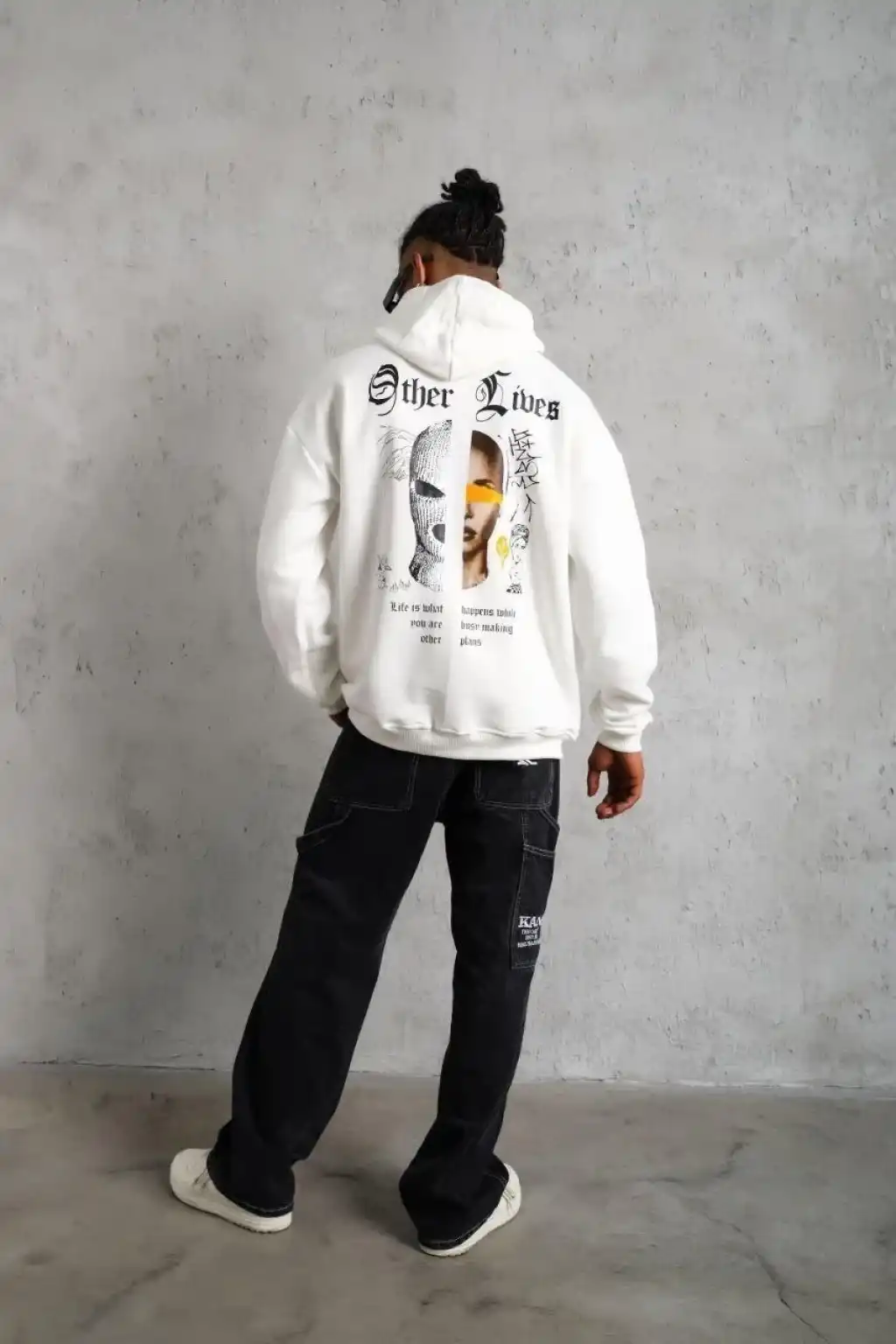 Erkek Oversize Üç İplik Şardonlu Kapüşonlu Sweatshirt – Beyaz “Other Lives” Ön ve Arka Baskılı, Kanguru Cepli, Ribanalı Rahat Kışlık Model Beyaz