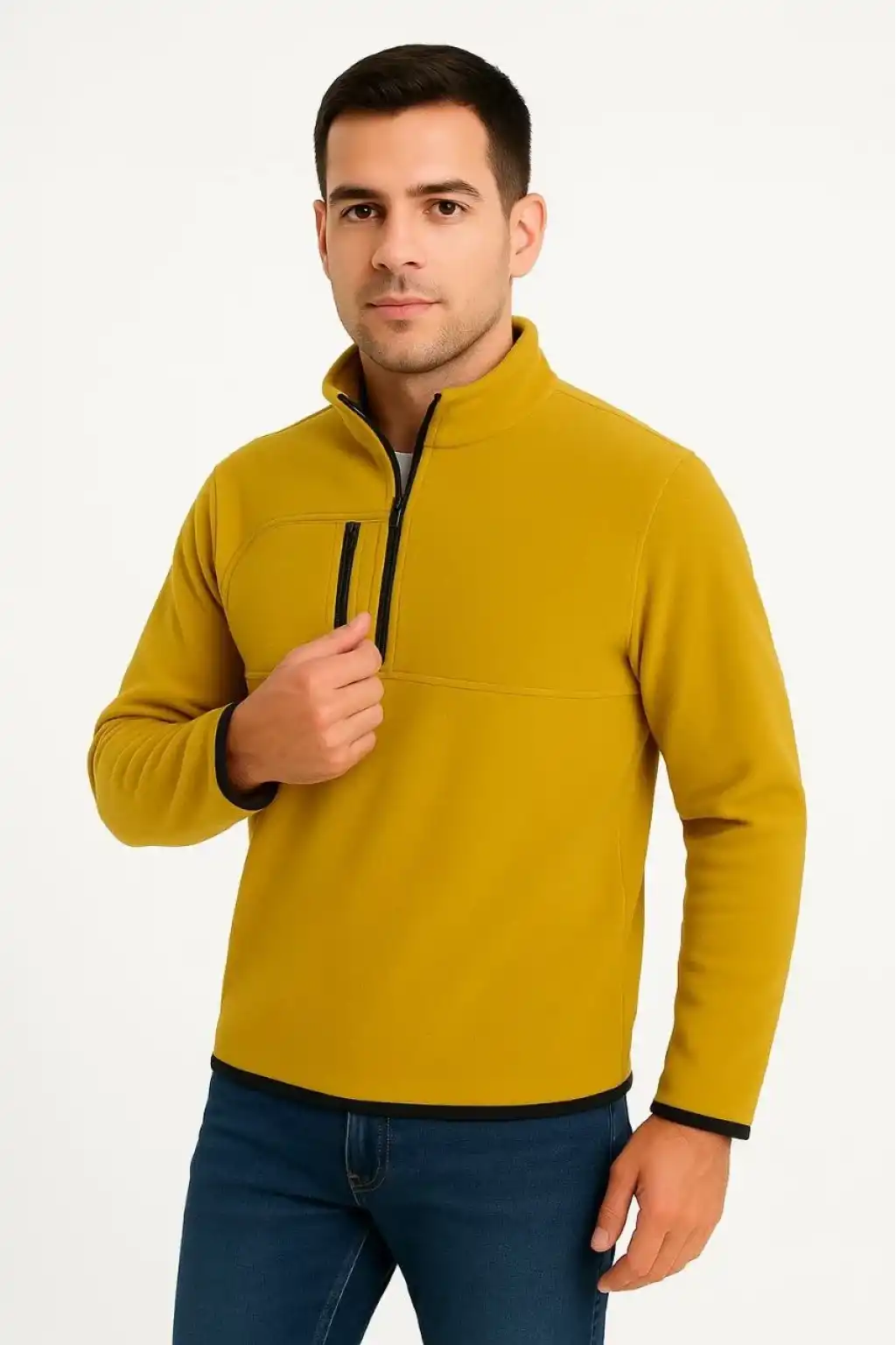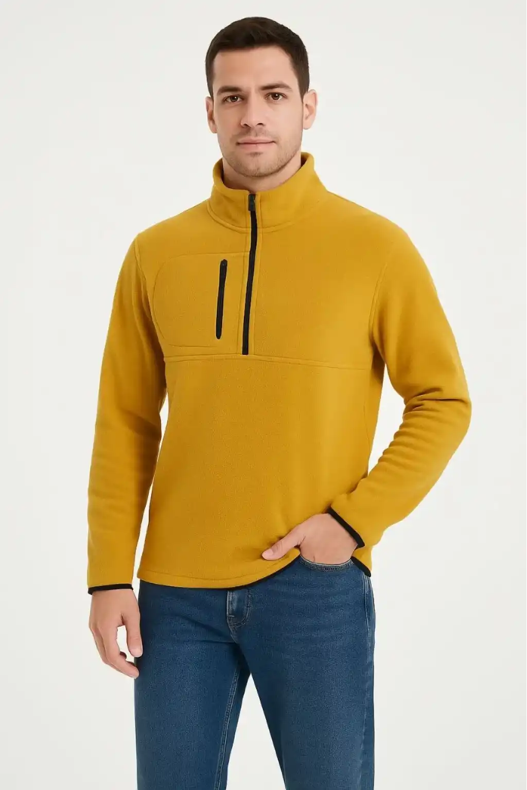Erkek Polar Kazak – Dik Yaka, Yarım Fermuarlı, Fermuarlı Göğüs Cepli, Siyah Biyeli, Kışlık Rahat Regular Fit Günlük Model - Sarı