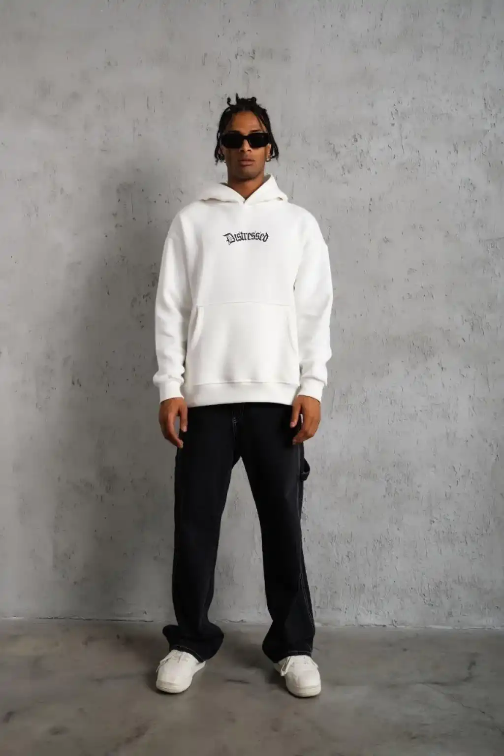 Erkek Premium Nakışlı Kapşonlu Sweatshirt Double Oversize Üç İplik Pamuklu - Siyah