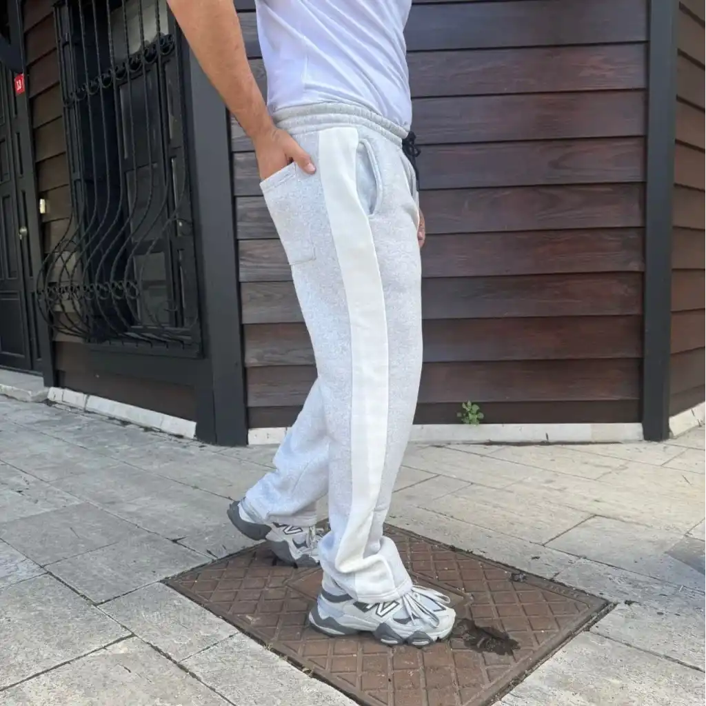 Erkek Üç İplik Kışlık Pamuklu Yandan Garneli Kalın Bej Şeritli Cepli Eşofman Altı - Gri