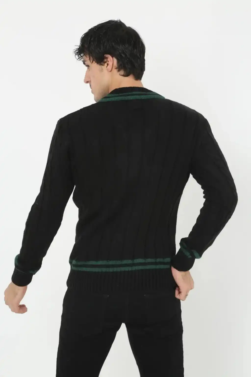 Erkek V Yaka Örgülü Kazak - Siyah