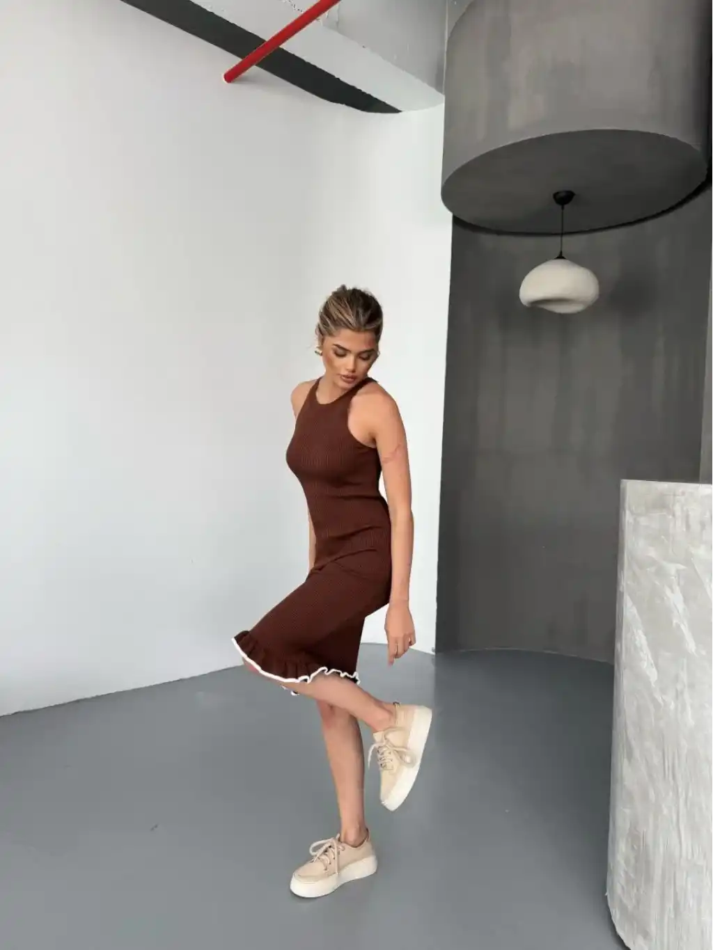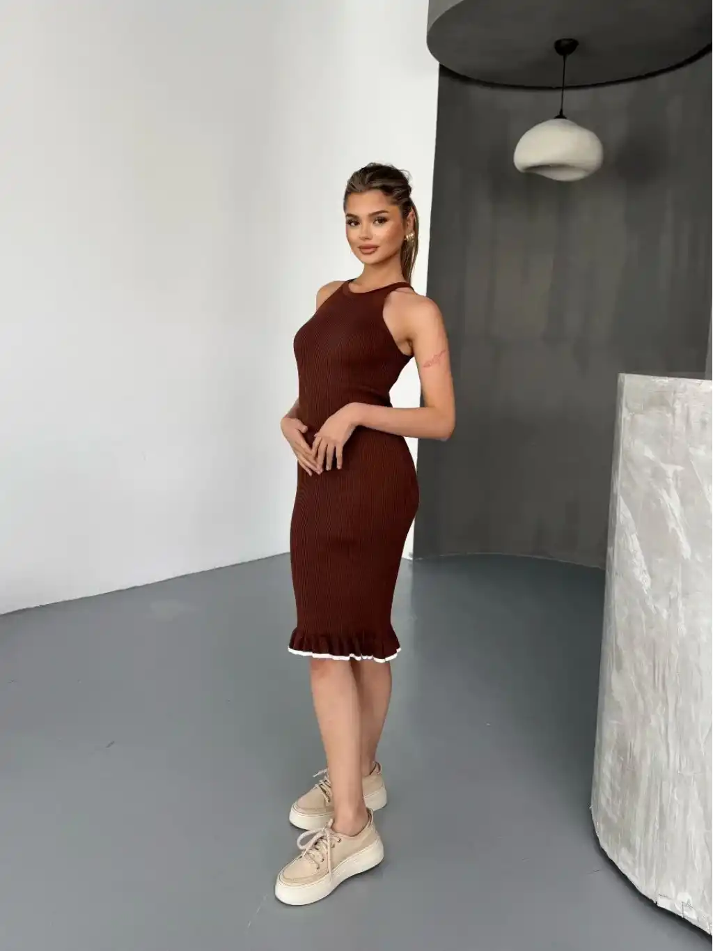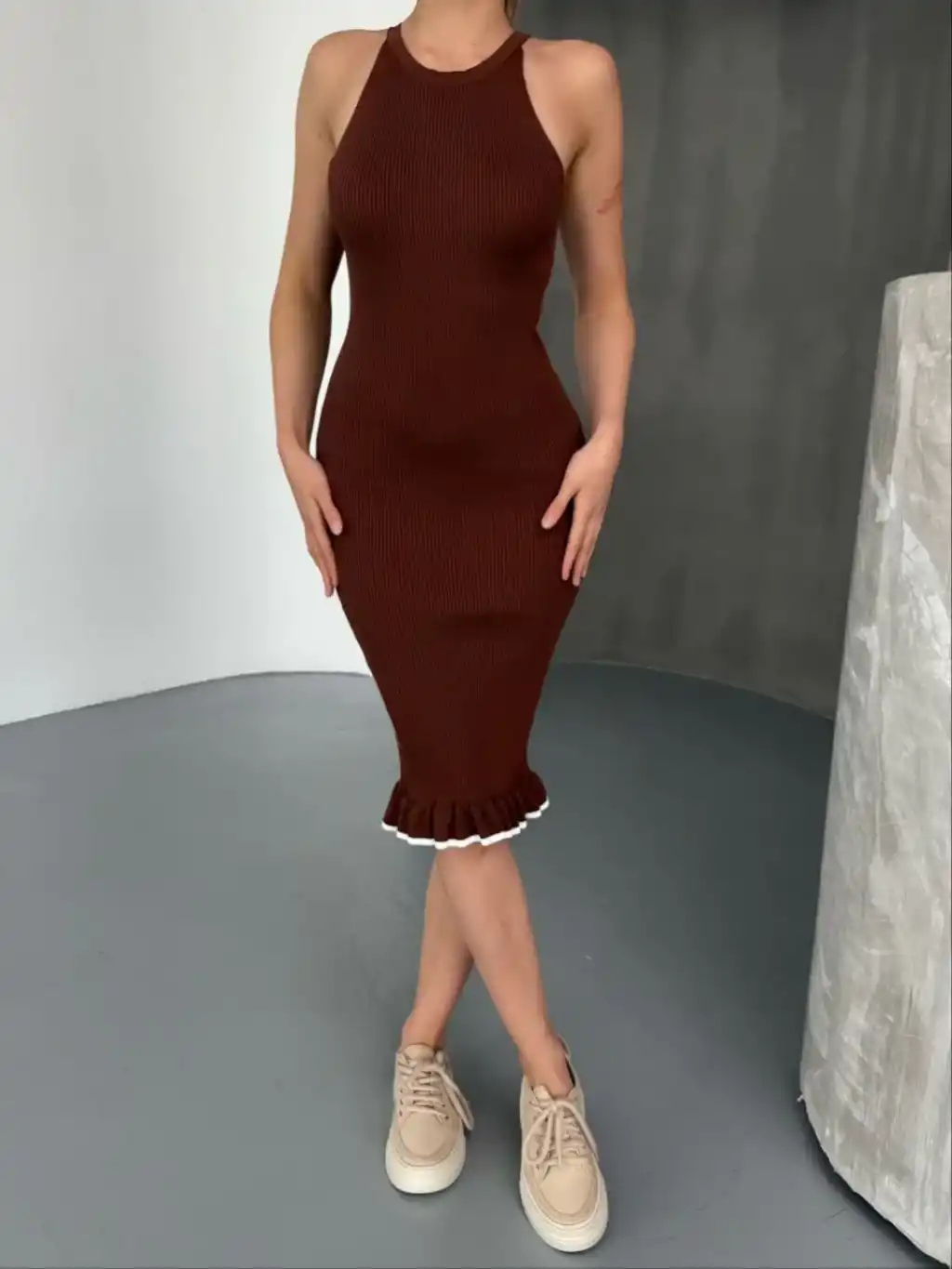 Fırfır Detaylı Triko Elbise- Kahverengi