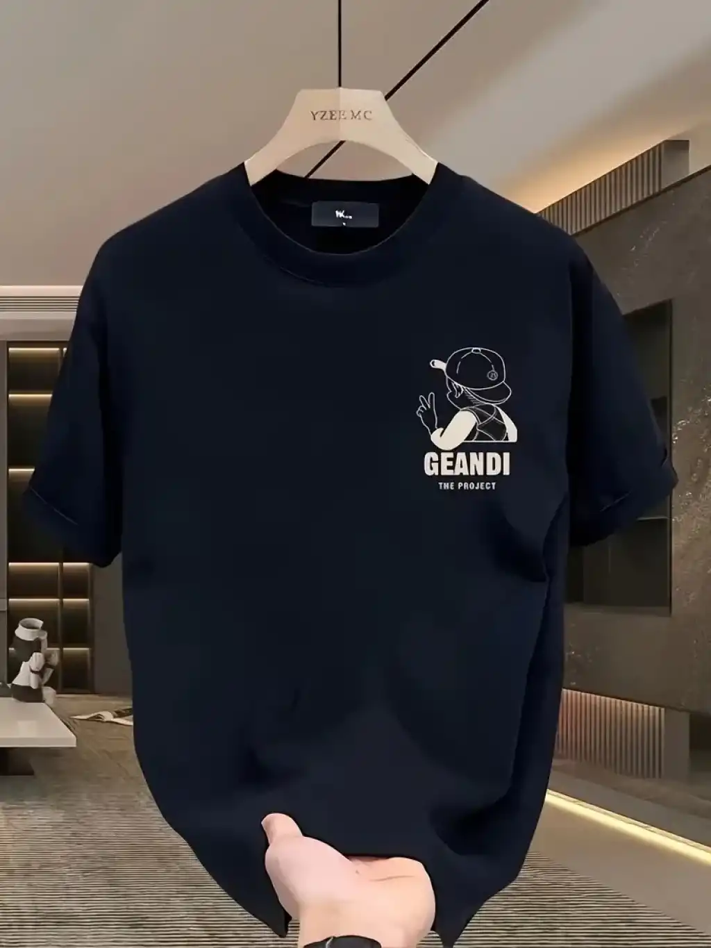 Rahat Bisiklet Yaka Tişört, Yaratıcı Karikatür Baskı - Yumuşak Polyester, Her Mevsim Giyilebilir- Siyah