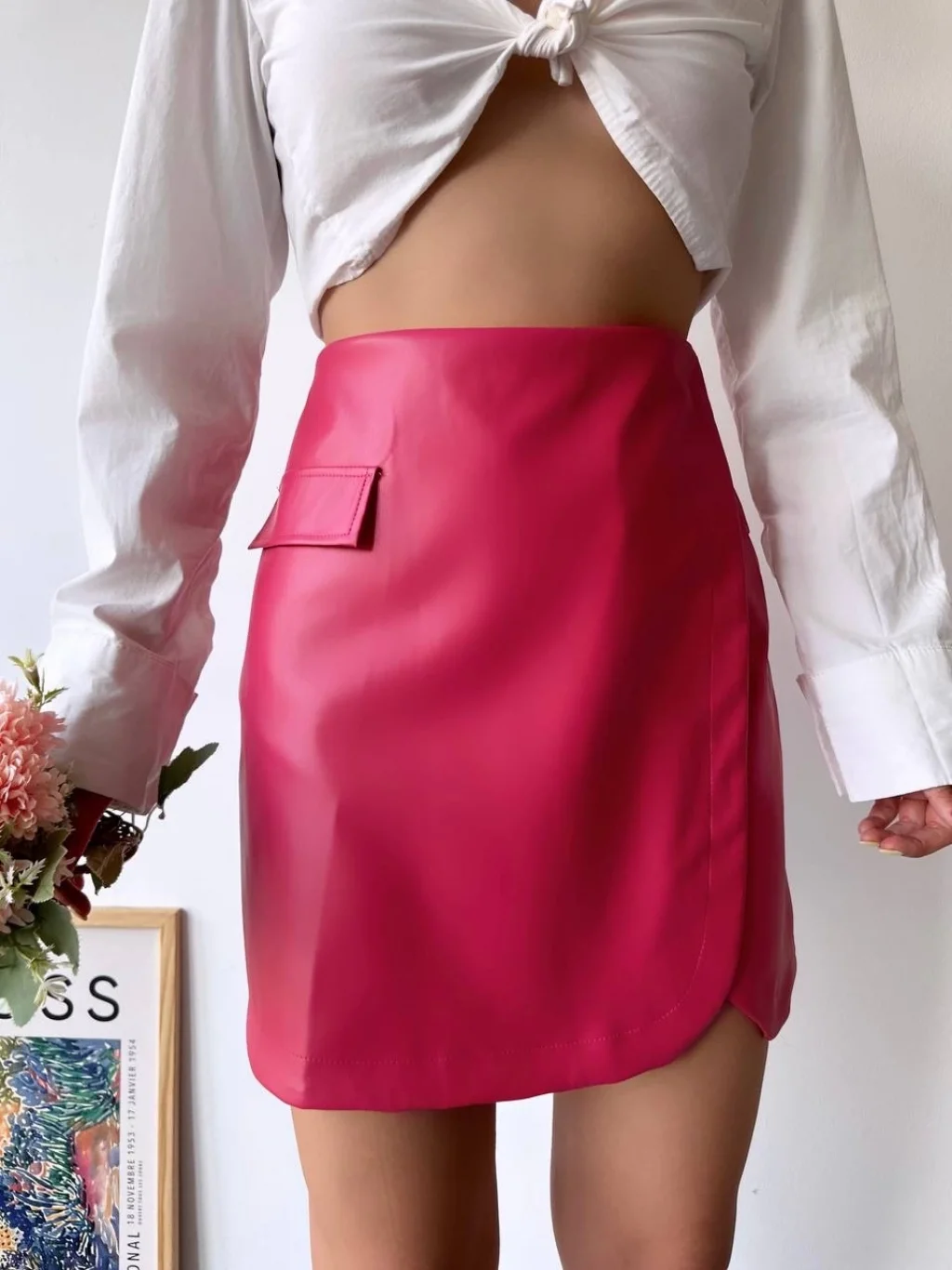 Cep detaylı oval kapaklı deri etek fuşya h240048