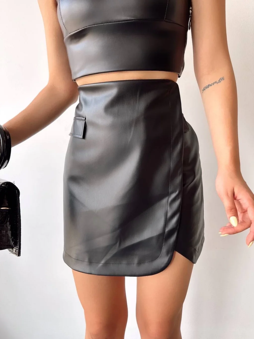 Cep detaylı oval kapaklı deri etek siyah h240048