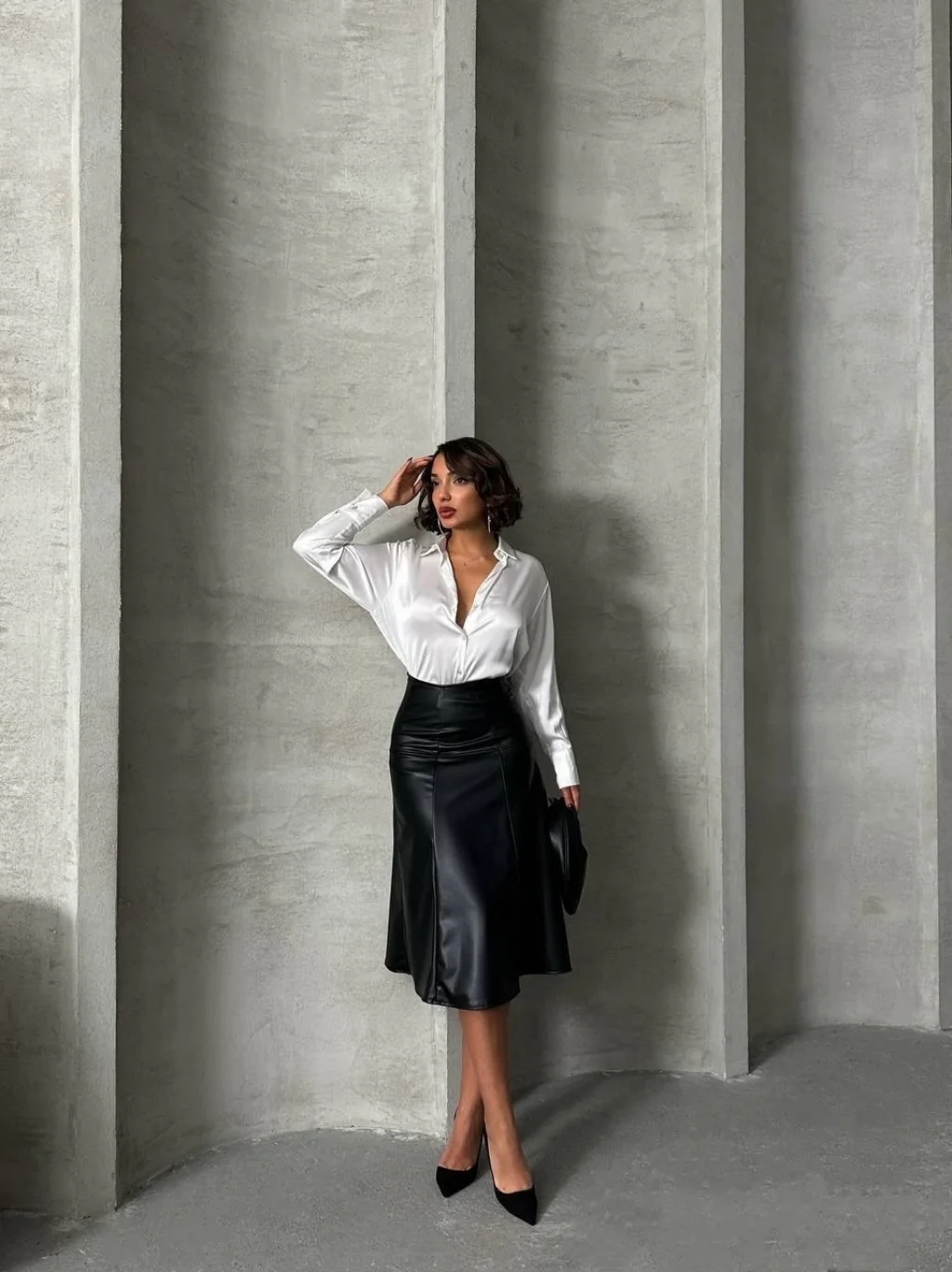 Cep detaylı oval kapaklı deri etek siyah h240048