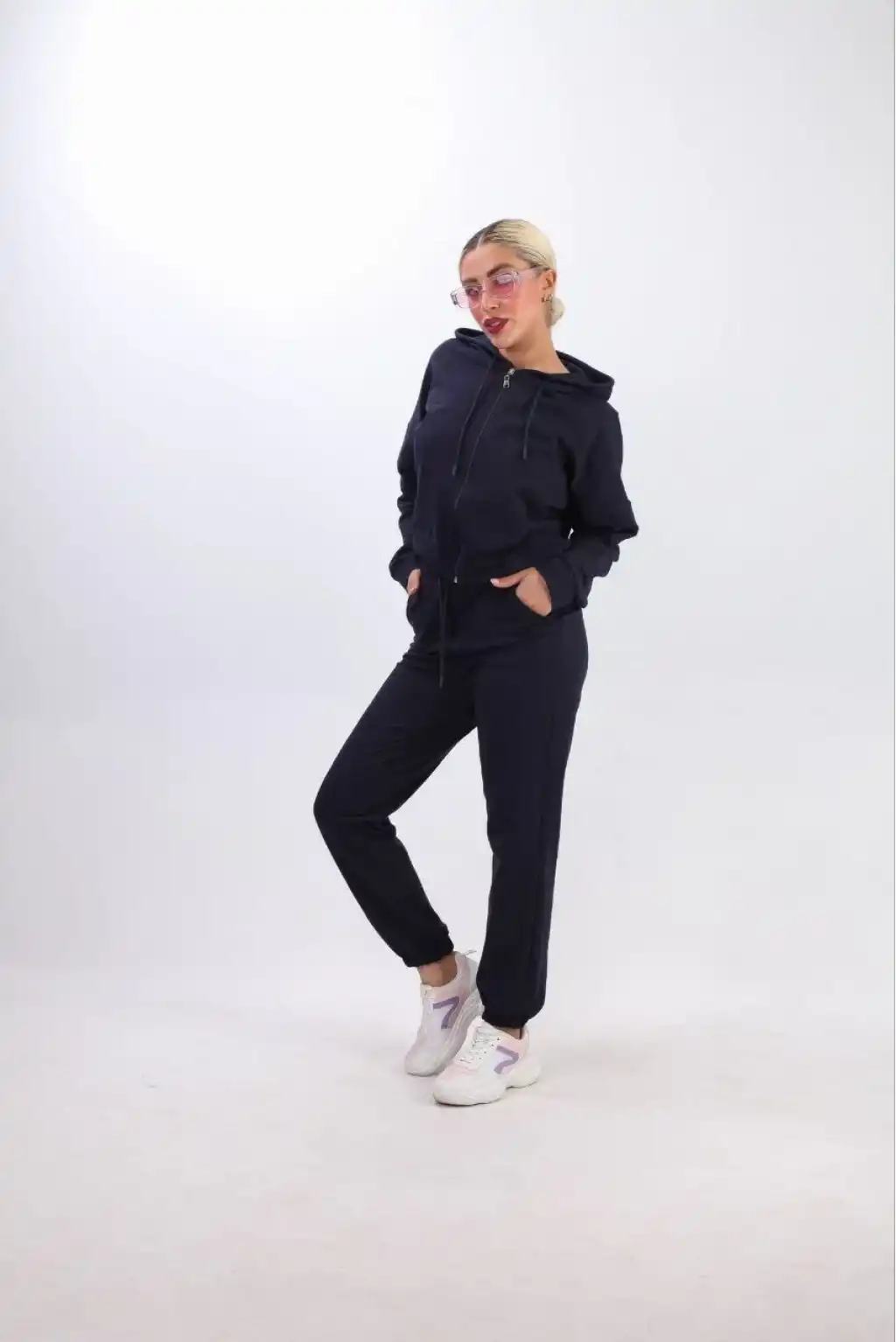 iki iplik Kapüşonlu Fermuarlı Crop Oversize Hırka Takım- Lacivert