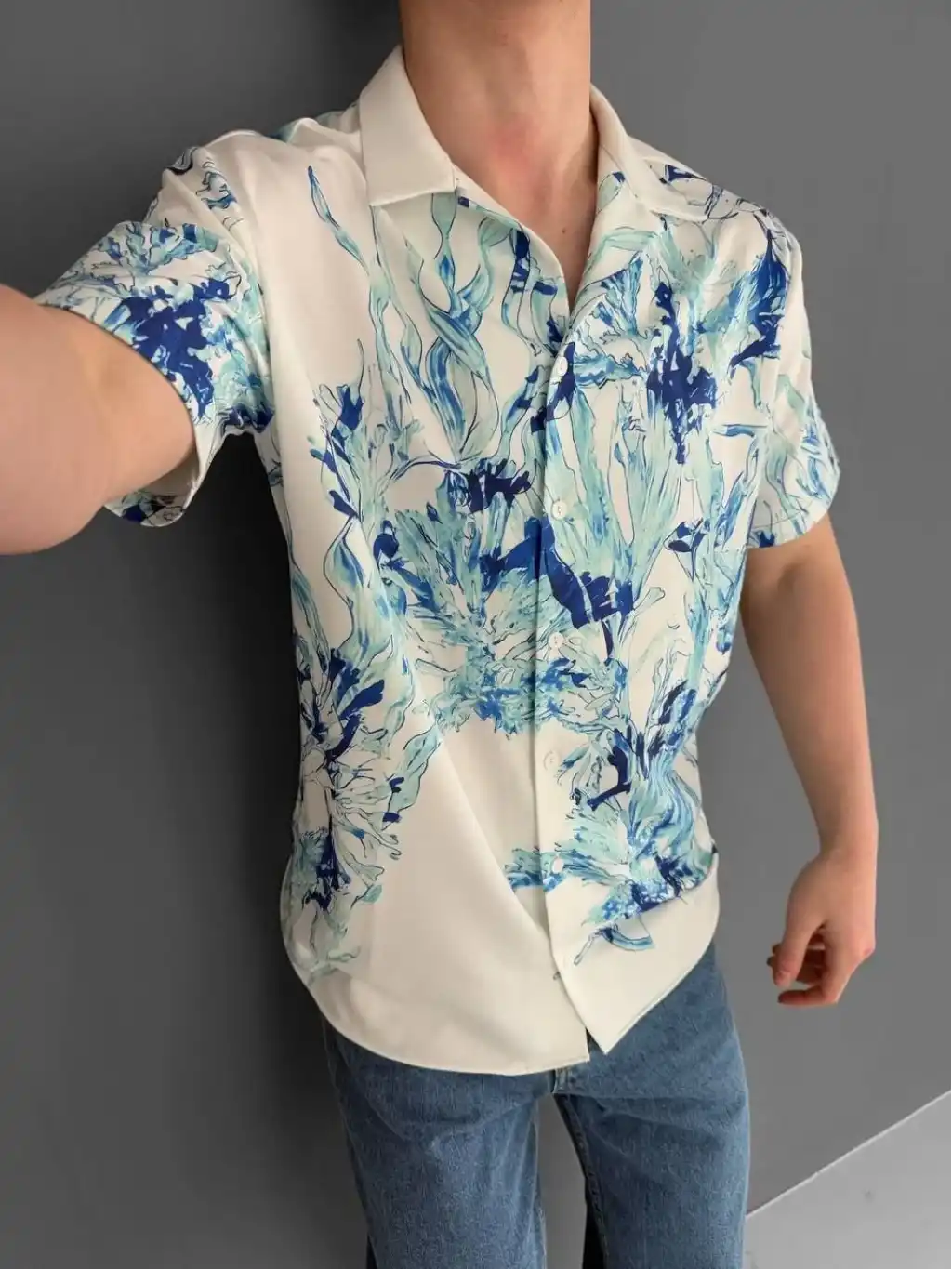 İki İplik Kumaş Baskılı Gömlek - Beyaz
