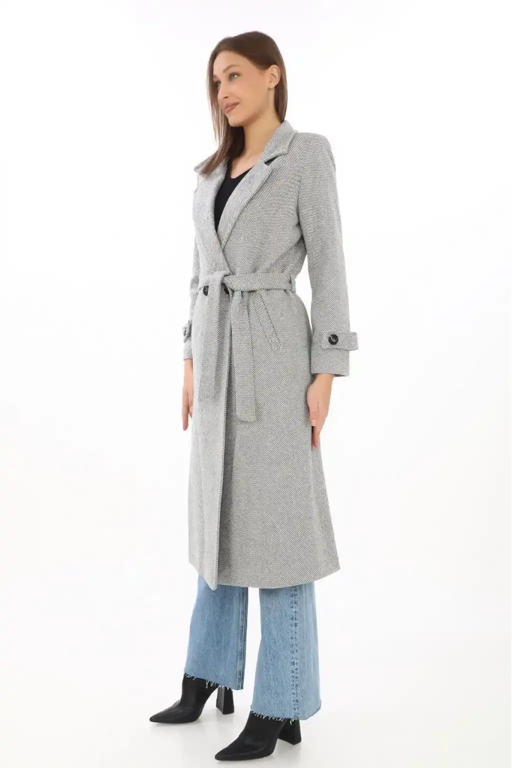 • Kadın Astarlı Balık Sırtı Kaşmir Kaşe Kaban - Gri