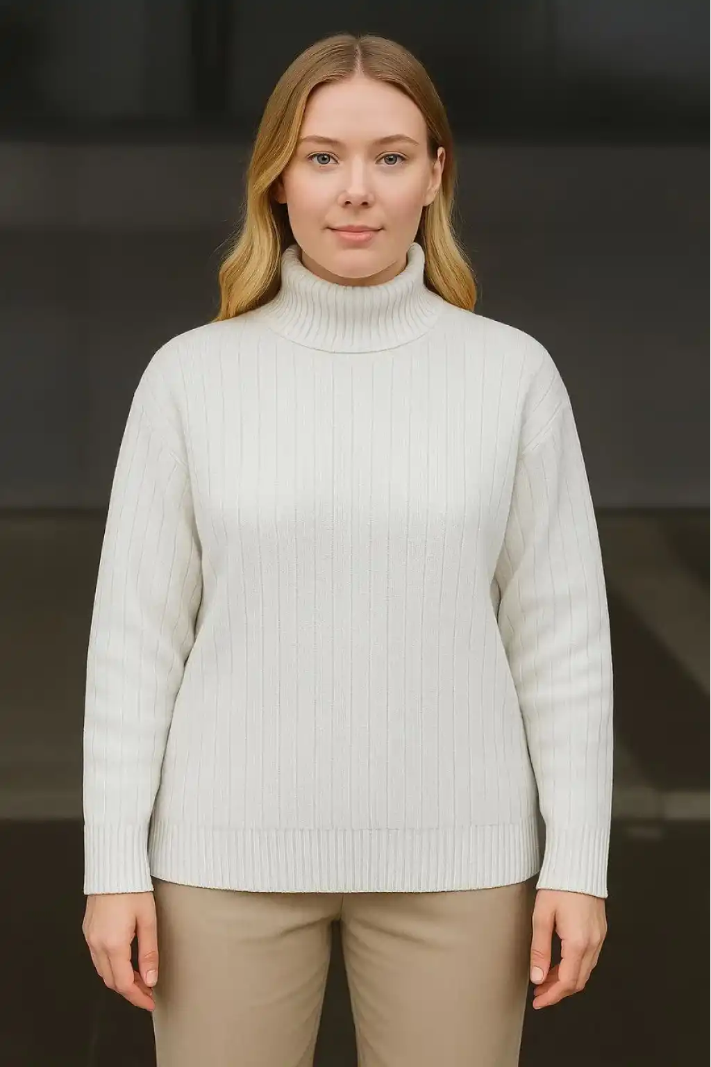 Kadın Balıkcı Yaka Bağazlı Triko Kazak Pamuklu Kalın Fitilli Dokuma - Beyaz