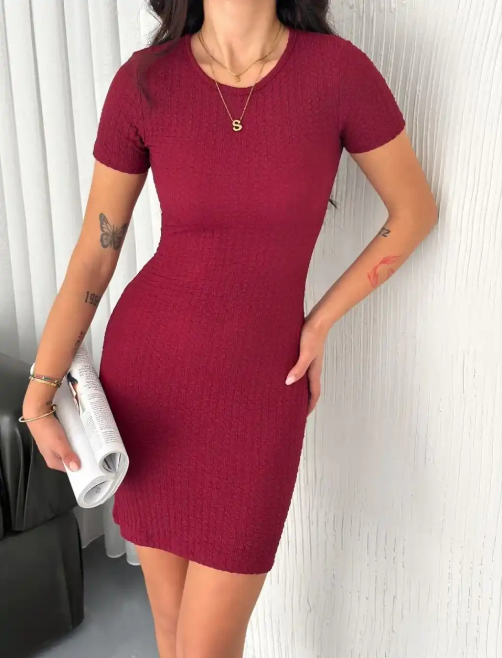 Kadın Bisiklet Yaka Kısa Kol Likralı Elbise - Bordo