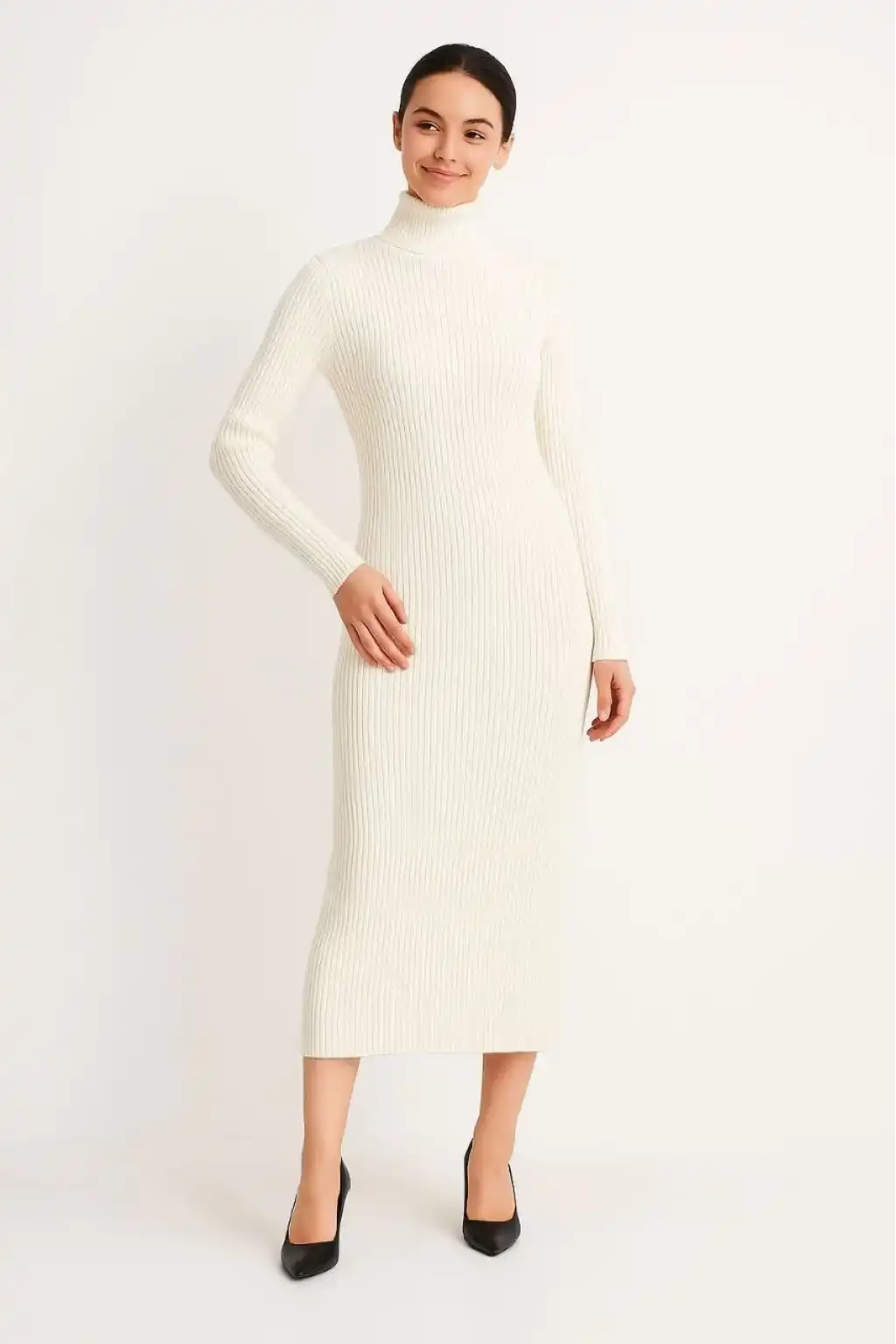 Kadın Boğazlı Triko Elbise – Uzun Fitilli Esnek Dokuma, Tam Kalıp, Kışlık & Baharlık Şık Rahat Stil, 130 cm Midi Boy Elbise - Beyaz
