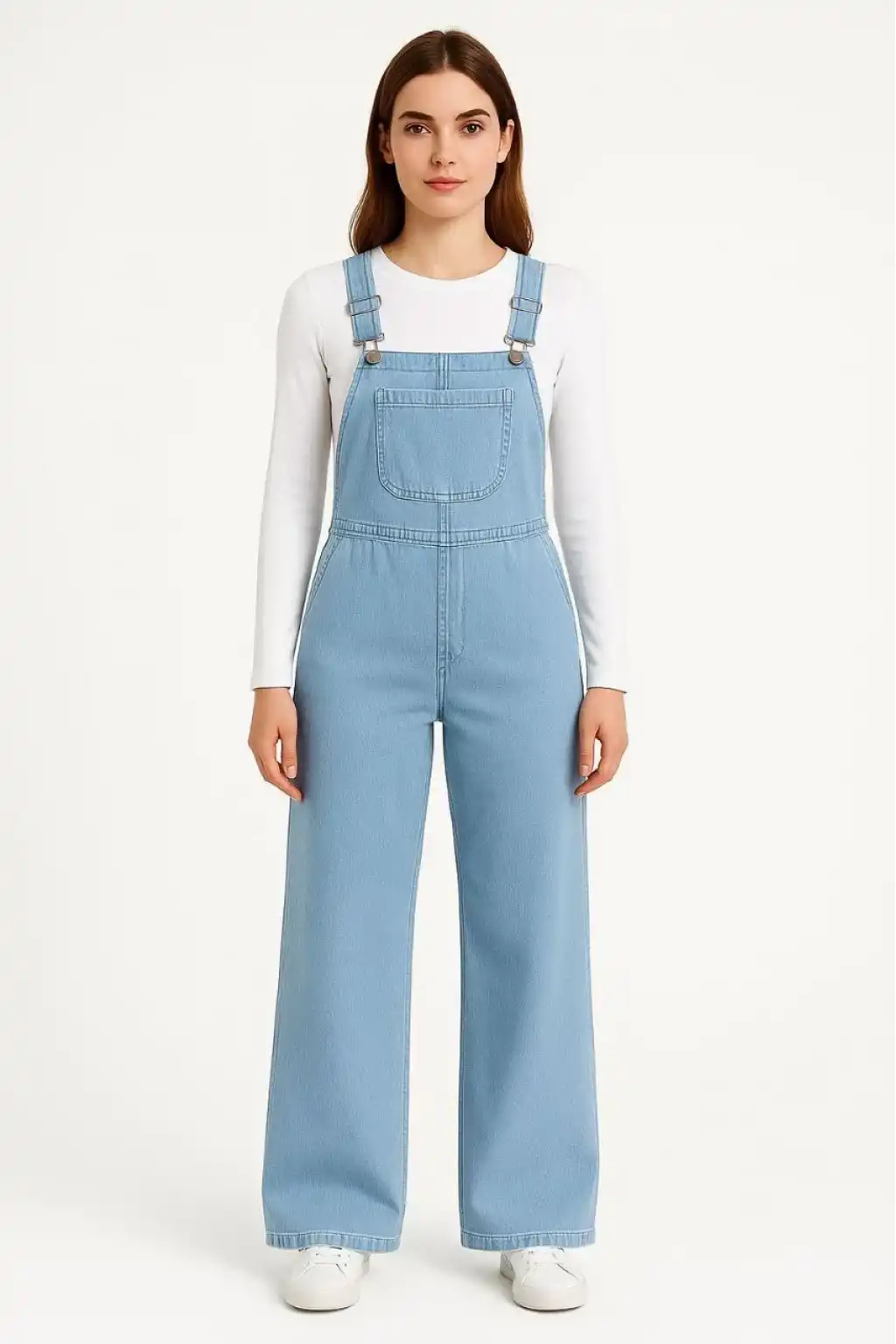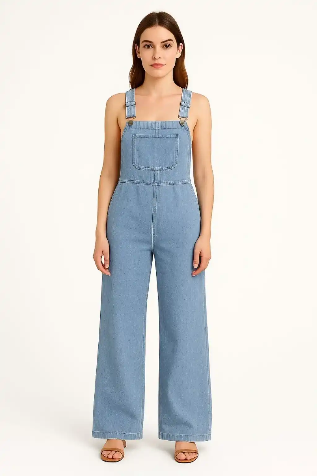 Kadın Chambray Açık Mavi Denim Görünümlü Geniş Paça Salopet Tulum - Mavi