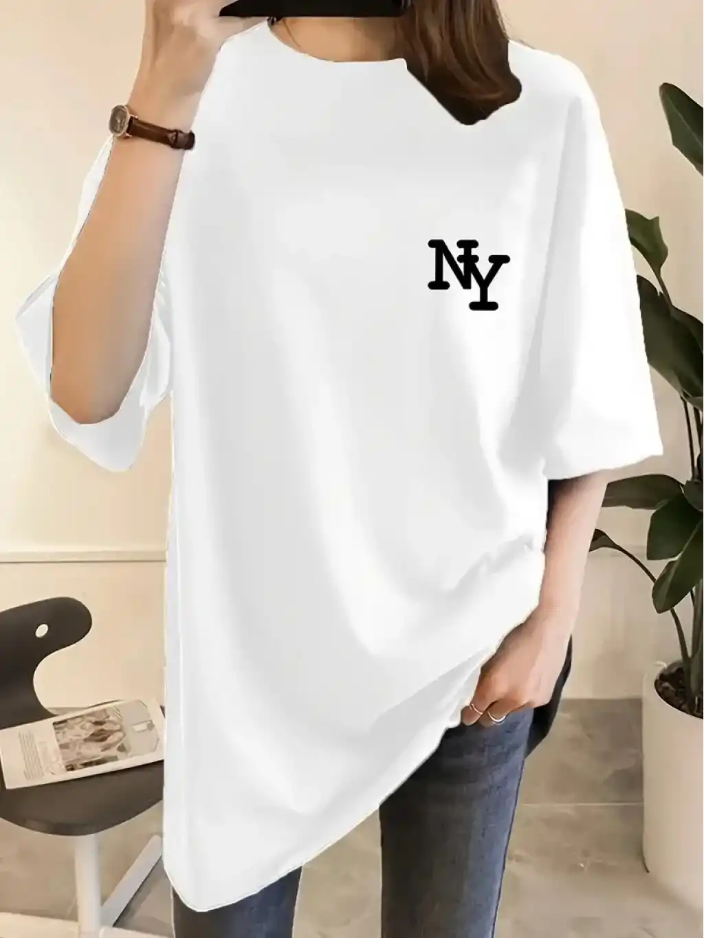 Kadın Eğlenceli Harf NY Baskılı Bisiklet Yaka Tişört - Rahat Polyester, Makinede Yıkanabilir - Yaz ve Fitness için Mükemmel, Yuvarlak Yaka- Beyaz
