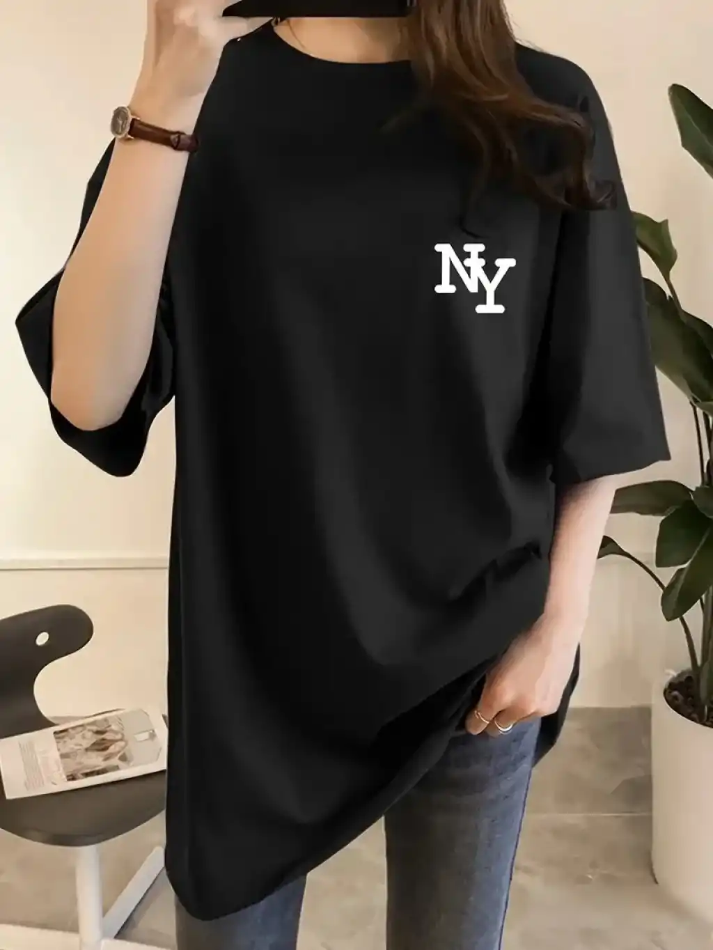 Kadın Eğlenceli Harf NY Baskılı Bisiklet Yaka Tişört - Rahat Polyester, Makinede Yıkanabilir - Yaz ve Fitness için Mükemmel, Yuvarlak Yaka - Siyah