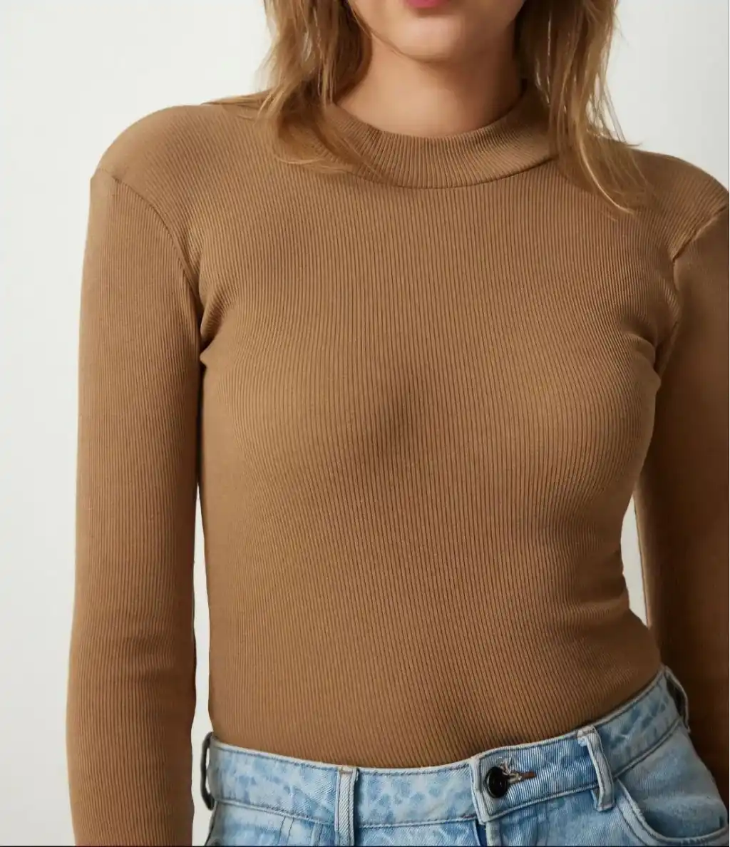 Kadın Full Likralı Fitilli Kaşkorse Body - Camel