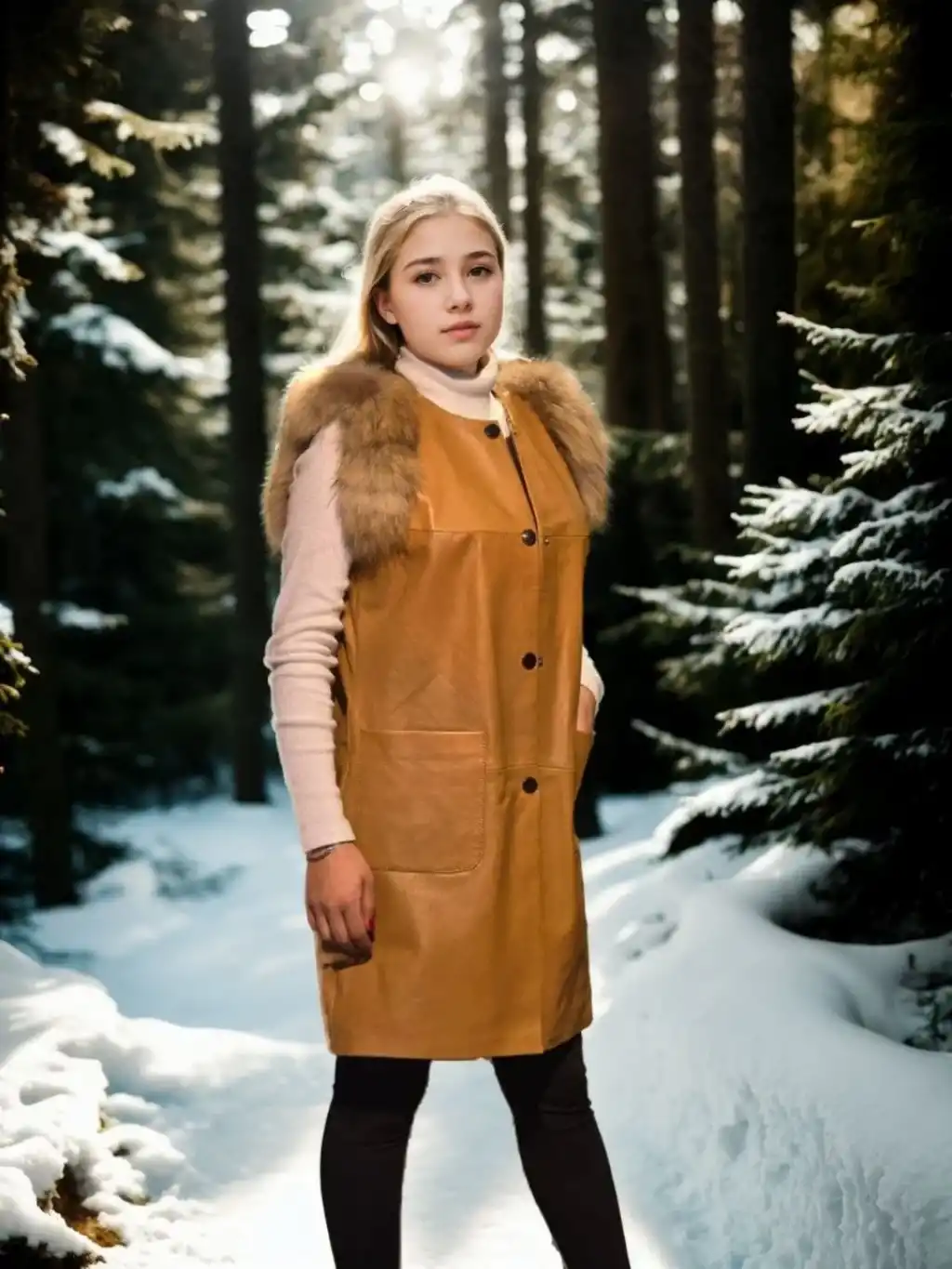 Kadın Kolsuz Hakiki Deri Kürk - Hardal