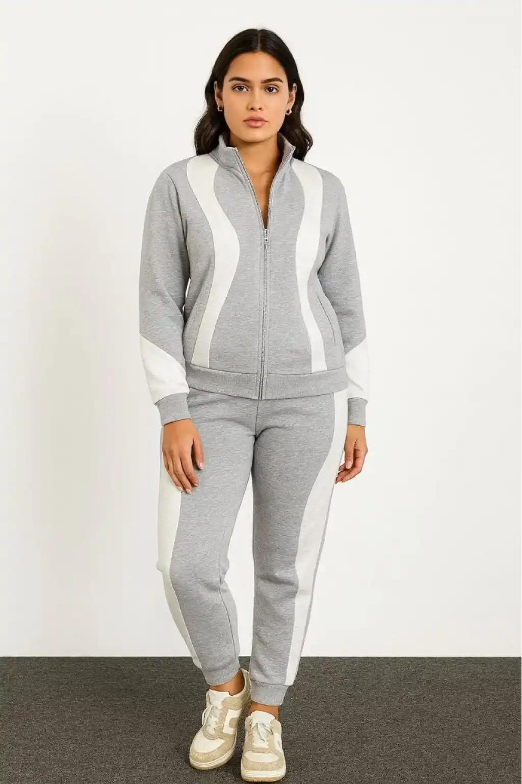 Kadın Premium Parçalı Eşofman Takım - Dik Yaka Fermuarlı Sweatshirt - Gri