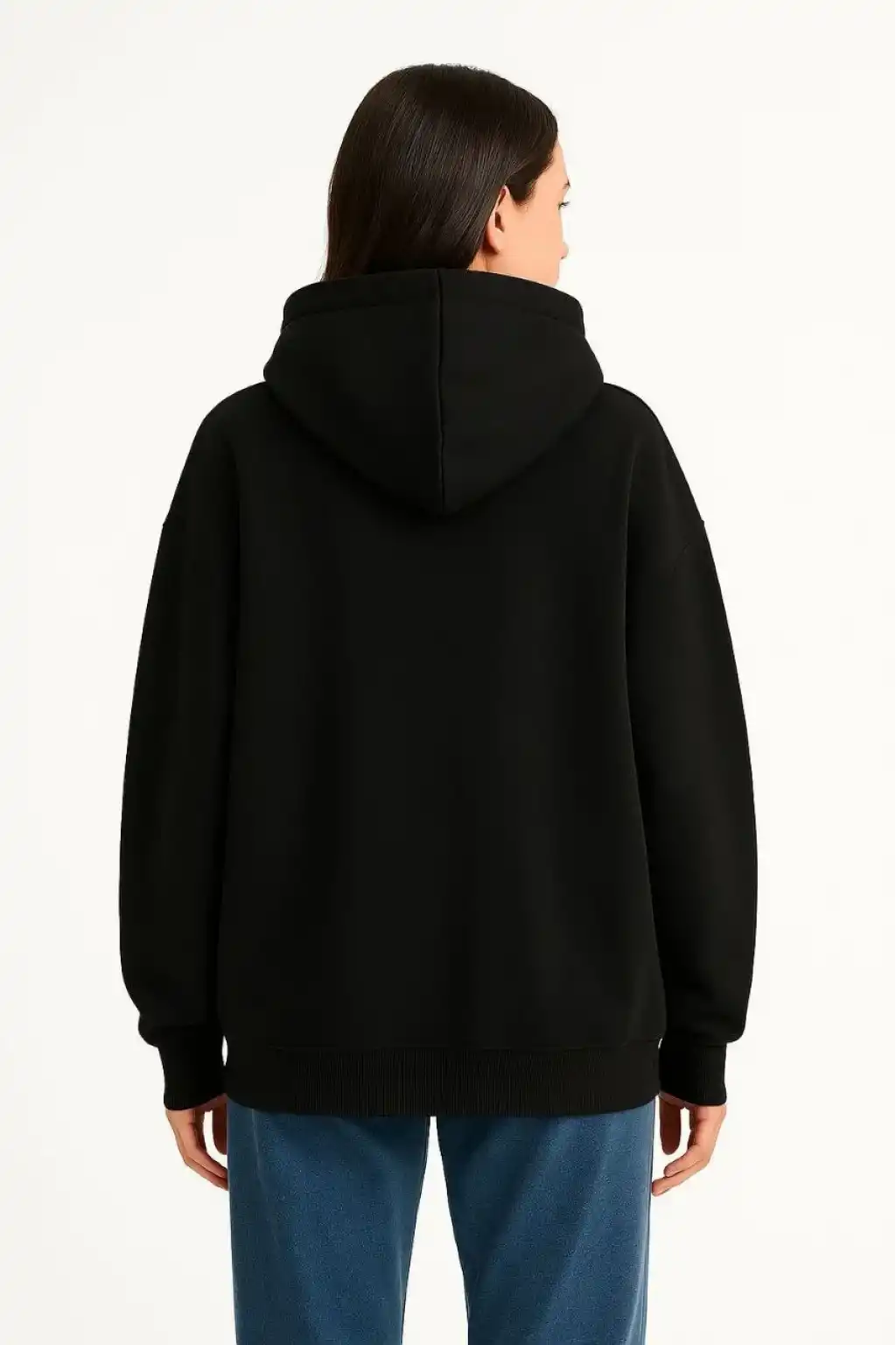 Kadın Üç İplik Kapüşonlu Kanguru Cepli Sweatshirt hoodie - Siyah