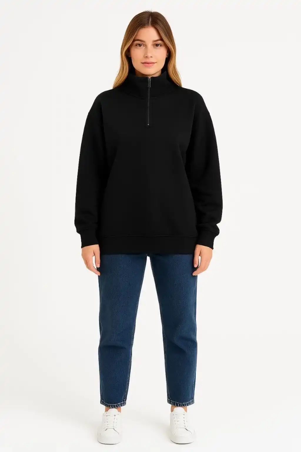 Kadın Üç İplik Dık Yaka Yarım Fermuarlı SweatShirt - Siyah