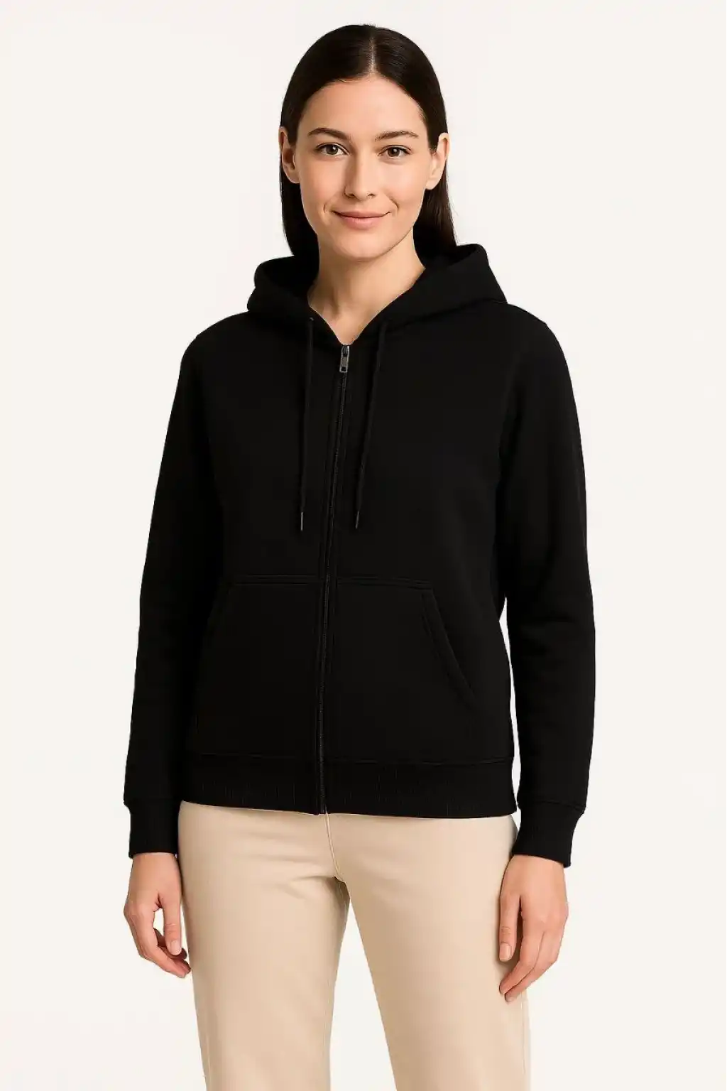 Kadın Üç İplik Kapüşonlu Tam Fermuarlı Kanguru Çepli SweatShirt Hoodie - Siyah