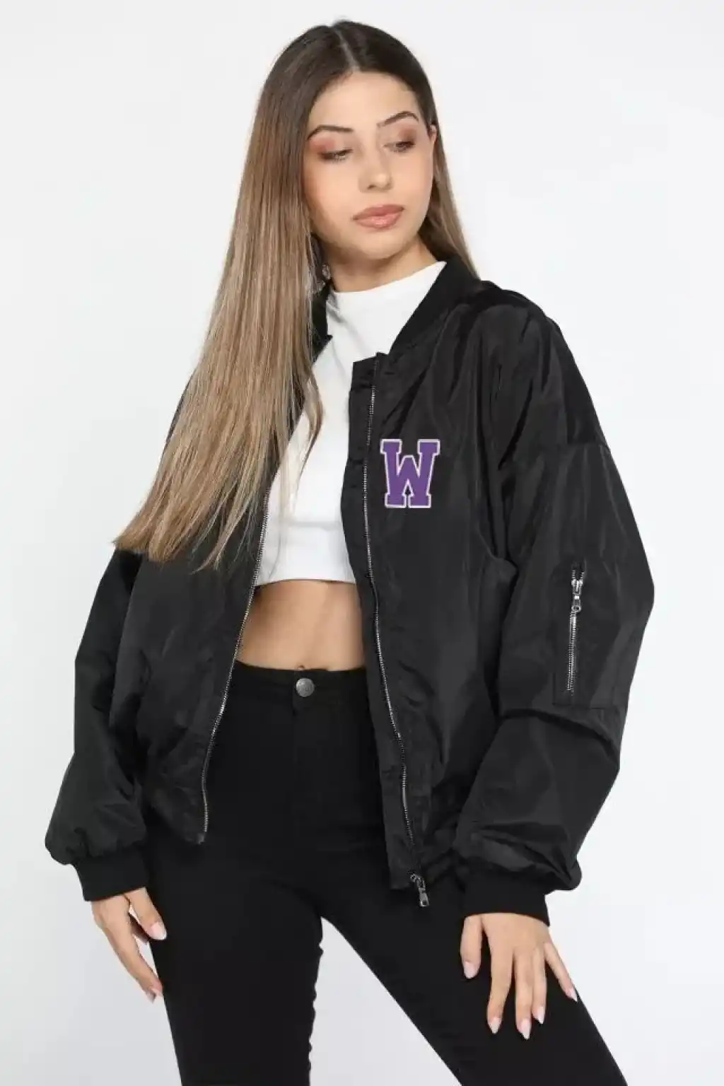 Kadın Wild One Baskılı Bomber Mont – Siyah Renk, Oversize Rahat Kalıp, Fermuarlı, Cepli, Günlük Şık Kapitone Mont - Siyah