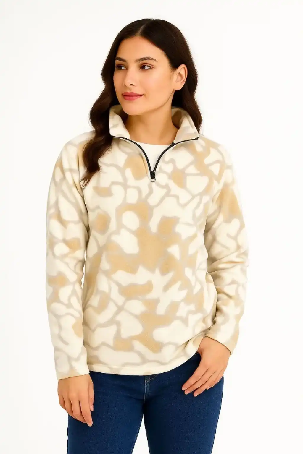 KADIN Yarım Fermuarlı Desenli Polar Sweat Yakalı, Uzun Kollu, Oversize Rahat Kalıp - Bej