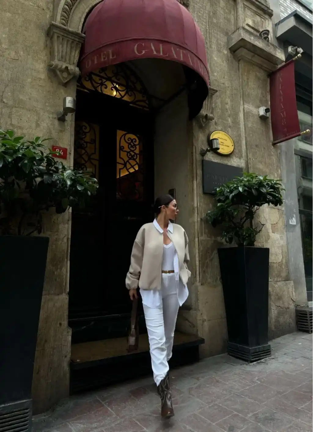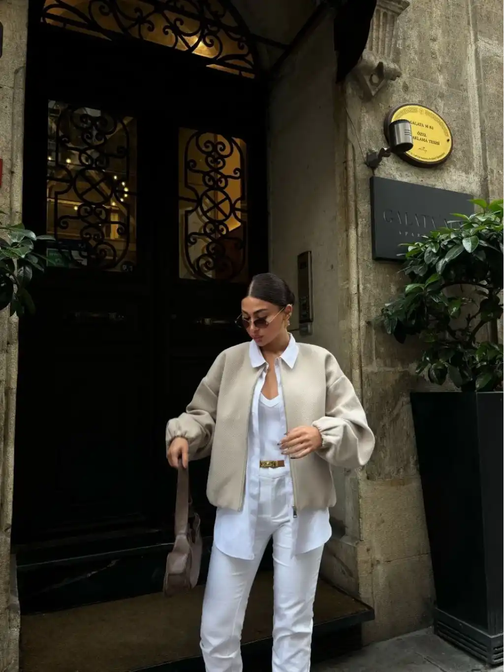 Fermuarlı Gömlek Yaka Bomber Ceket - Beyaz