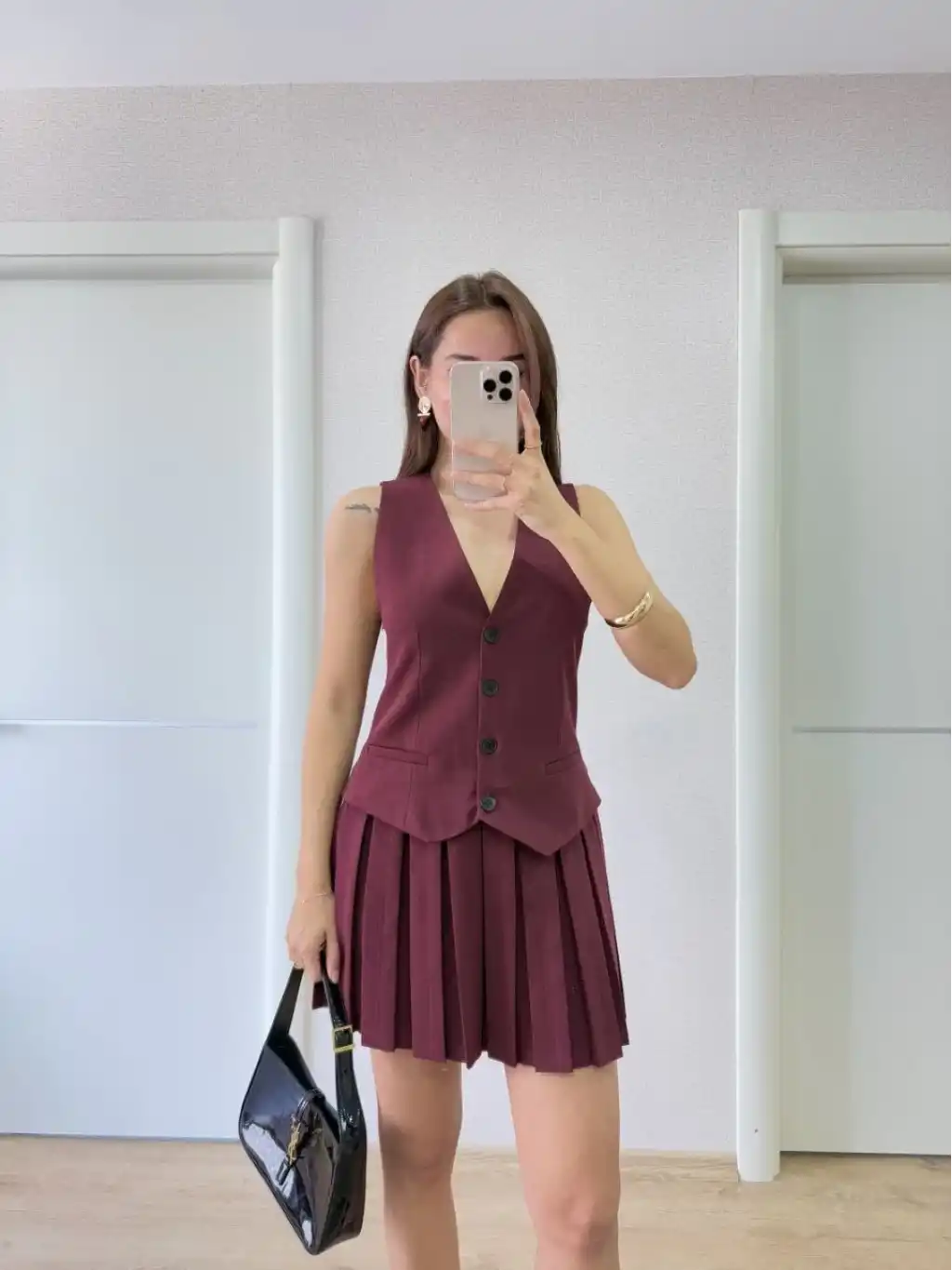 Keten Takım Görünümlü Düğme Detaylı Yelekli Mini Elbise - Bordo