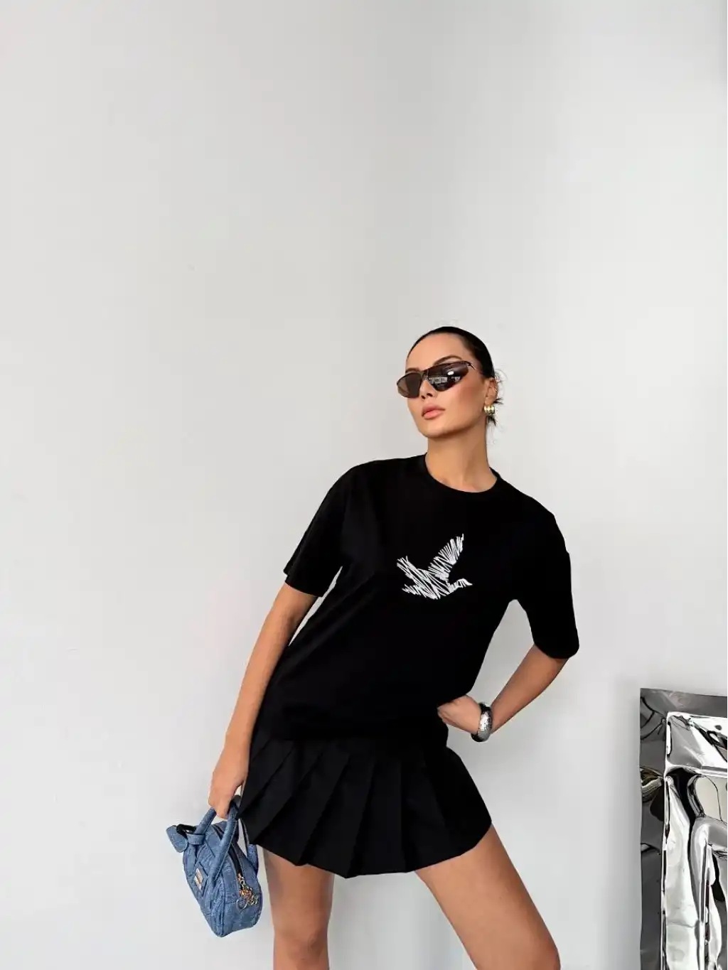 AICG Ön Arka Baskılı Bisiklet Yaka Kadın Oversize Bisiklet Yaka T-shirt - Siyah