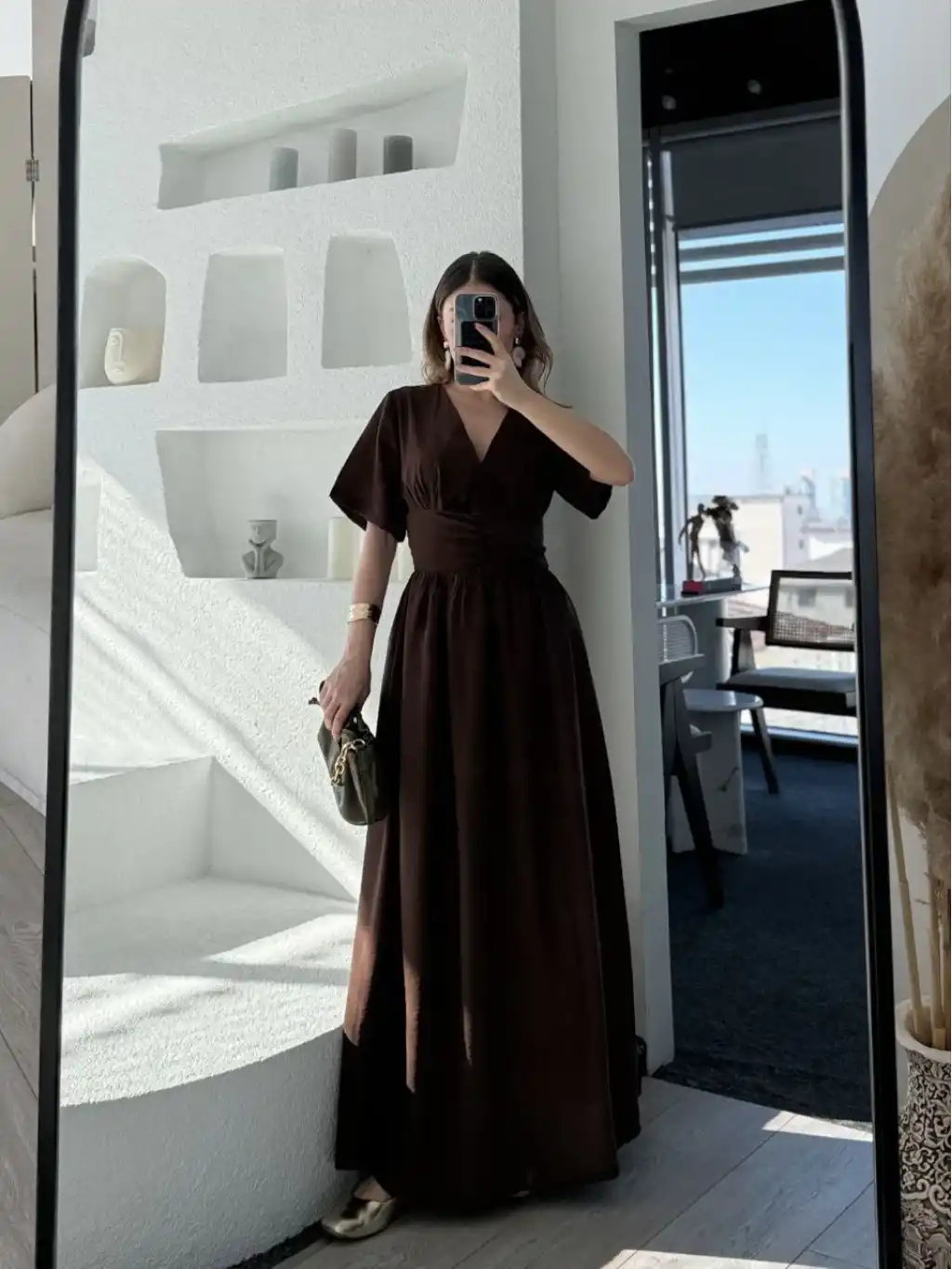 Sırt Dekolteli Kolsuz Uzun Elbise - Kahverengi