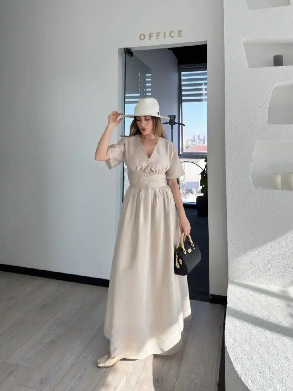 Krep Arkası Kanat Arka Ön Pens Detaylı Uzun Kadın Elbise - Bej