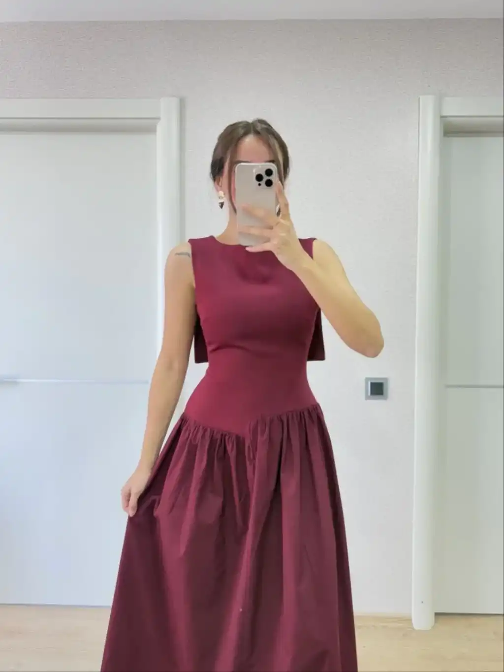 Kolsuz Göğüs Lastıklı %100 Poplin Uzun Elbise - Bordo