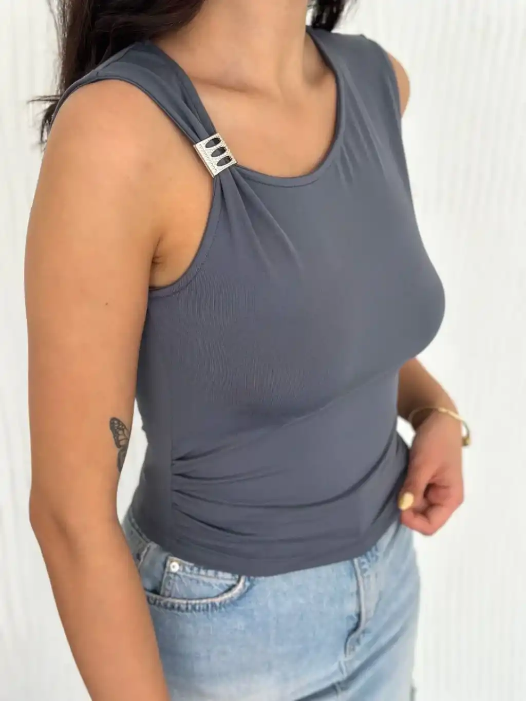 Osy Modal Yumuşak Dokulu Kumaş Bisiklet Yaka Kadın Sıfır Kol Bluz Omuz Toka Aksesuar Detaylı - Antrasit