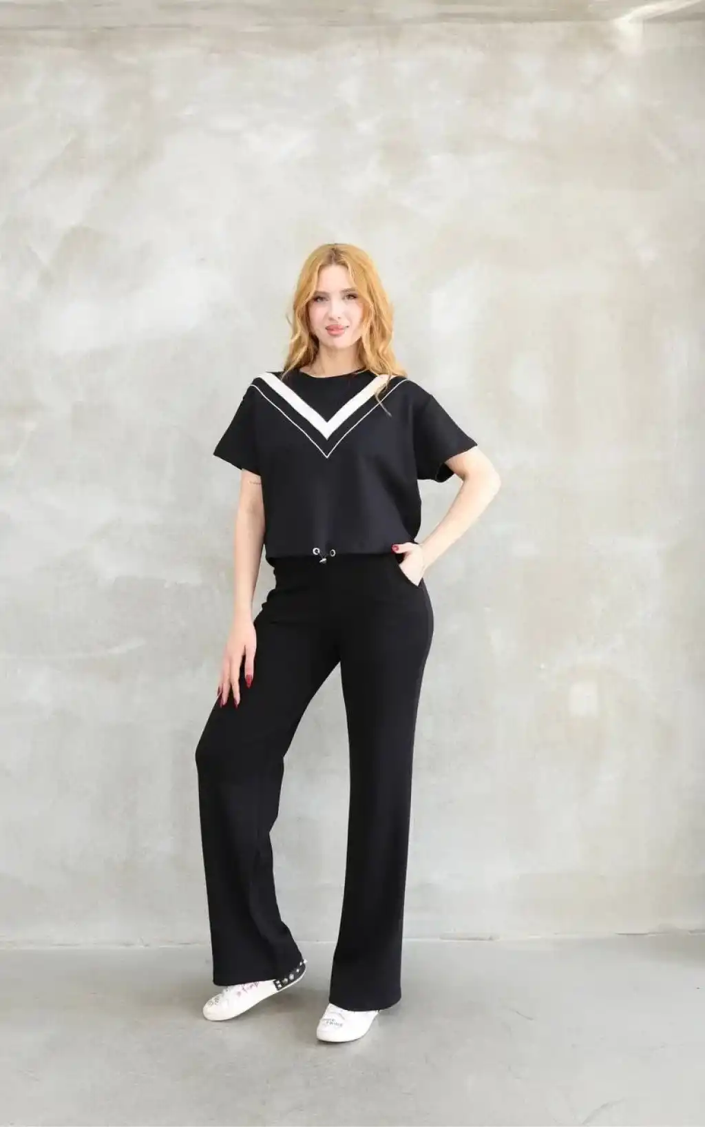 Osy Modal Yumuşak Dokulu Kumaş Bisiklet Yaka T-shirt Bol paça Pantalon ikili Takım -Siyah