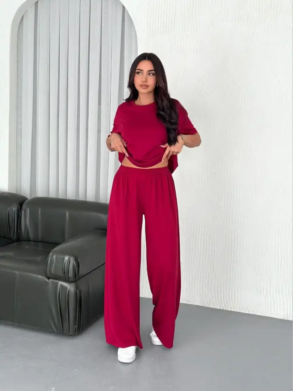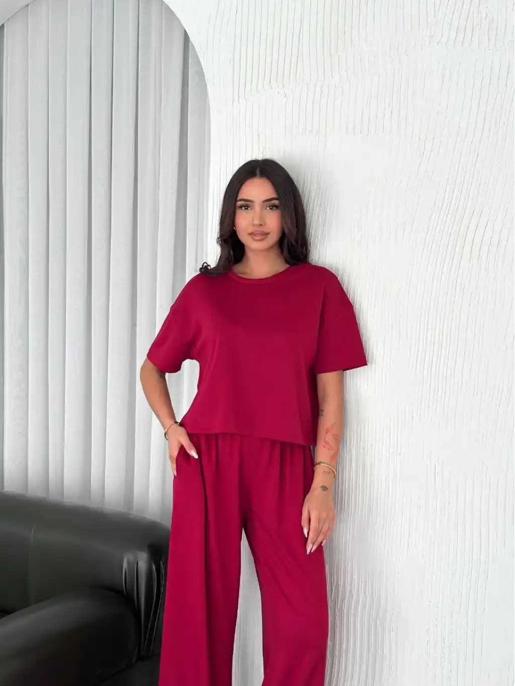 Osy Modal Yumuşak Dokulu Kumaş Bisiklet Yaka T-shirt Bol paça Pantalon ikili Takım -Bordo