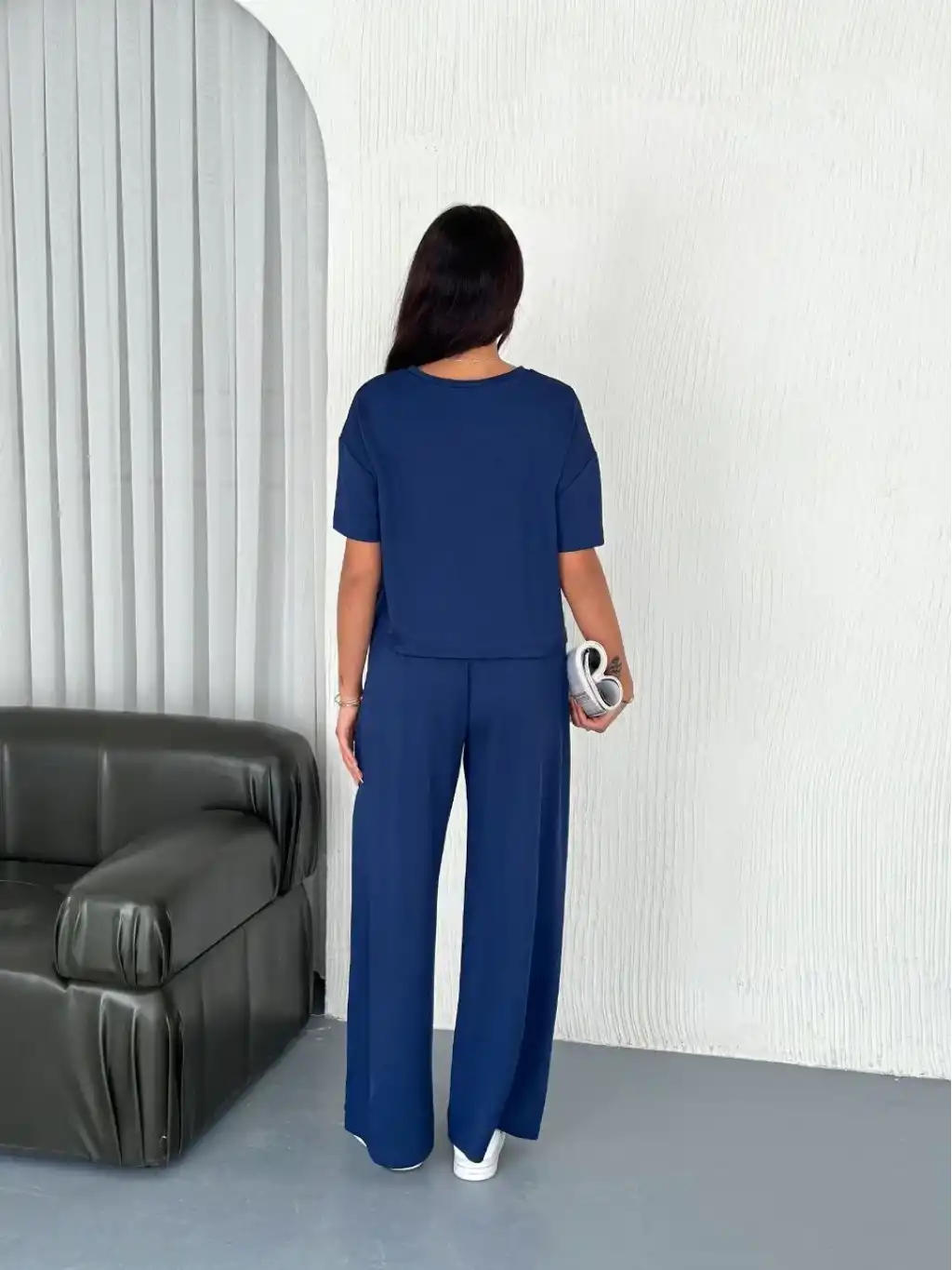 Osy Modal Yumuşak Dokulu Kumaş Bisiklet Yaka T-shirt Bol paça Pantalon ikili Takım -Saks Mavi