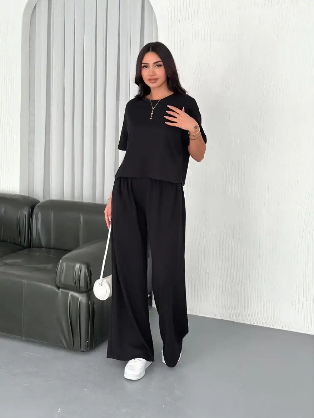 Osy Modal Yumuşak Dokulu Kumaş Bisiklet Yaka T-shirt Bol paça Pantalon ikili Takım -Siyah