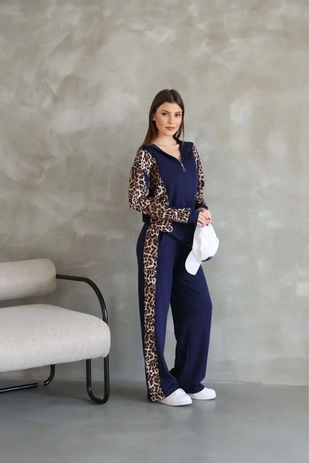 Osy Modal Yumuşak Dokulu Kumaş Kapüşonlu Leopar Desenli Fermuarlı Takım - Lacivert