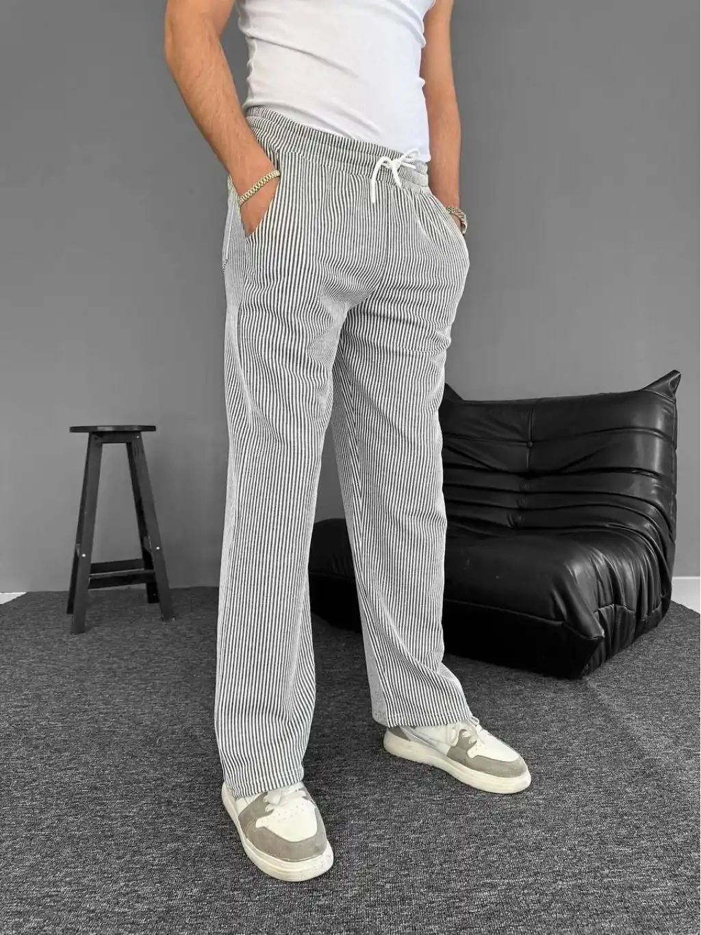Erkek Cizgili Dokuma Krep Jogger Buggy Pantalon Rahat kalıp - Beyaz