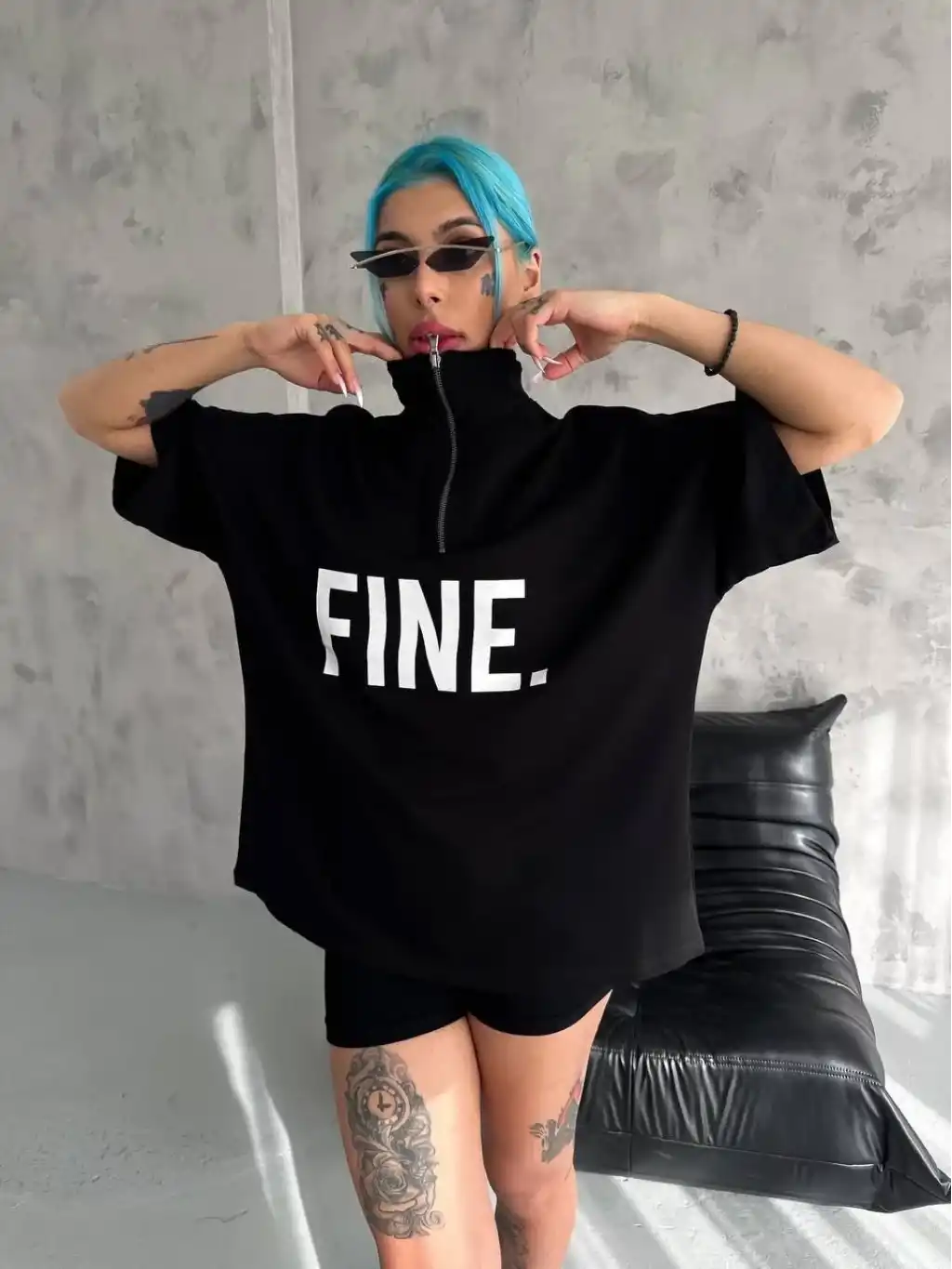 Unisex Baskılı Yarım Fermuarlı T-Shirt - Siyah